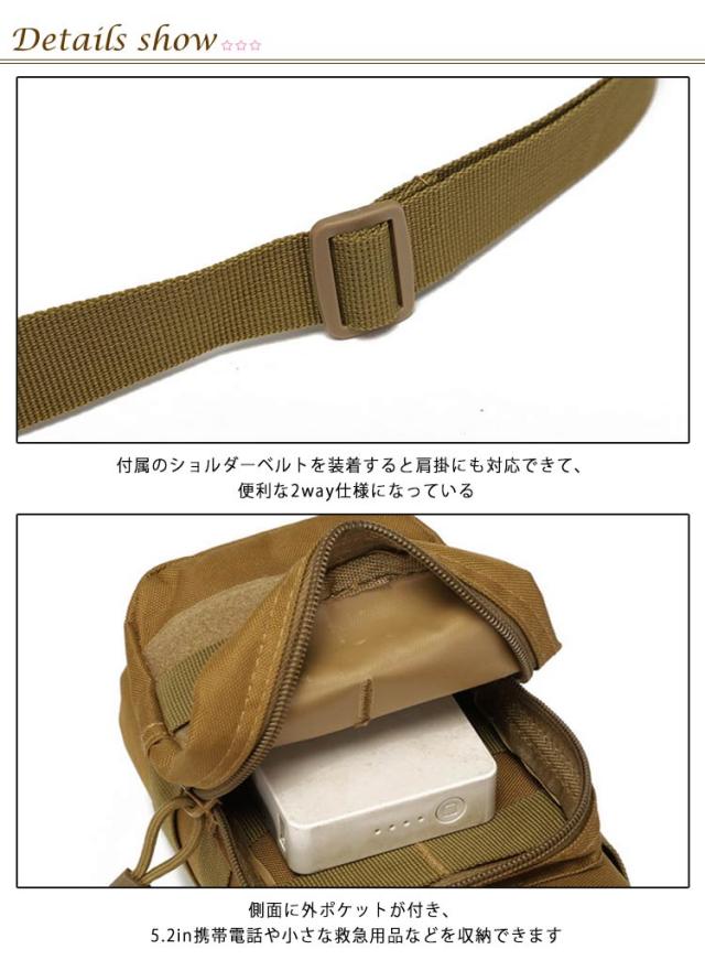 | 付属のショルダーベルトを装着すると肩掛にも対応できて、便利な2way仕様になっている。 モールストラップ付きで、モール対応したバックパック、ベルト、ベストに装着してアクセサリーとして利用可能で、持ち運びには手軽である。 付属のショルダーベルトを装着すると肩掛にも対応できて、便利な2way仕様になっている。 側面に外ポケットが付き、5.2in携帯電話や小さな救急用品などを収納できます。 アウトドア愛好家に最適で、フィットネス、登山、サイクリング、遠足、キャンプなどのアウトドア活動に適しています。 | |