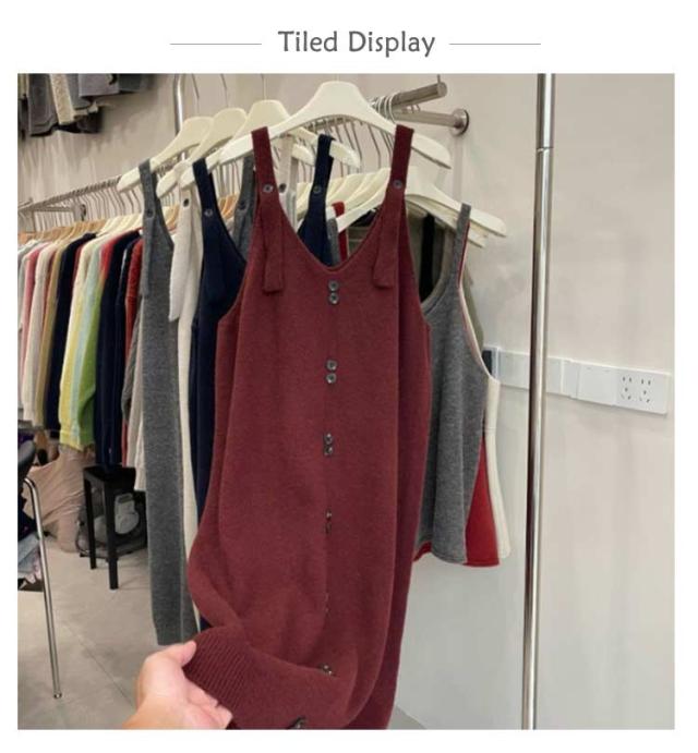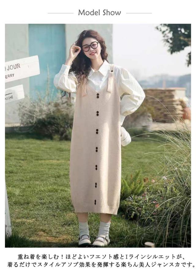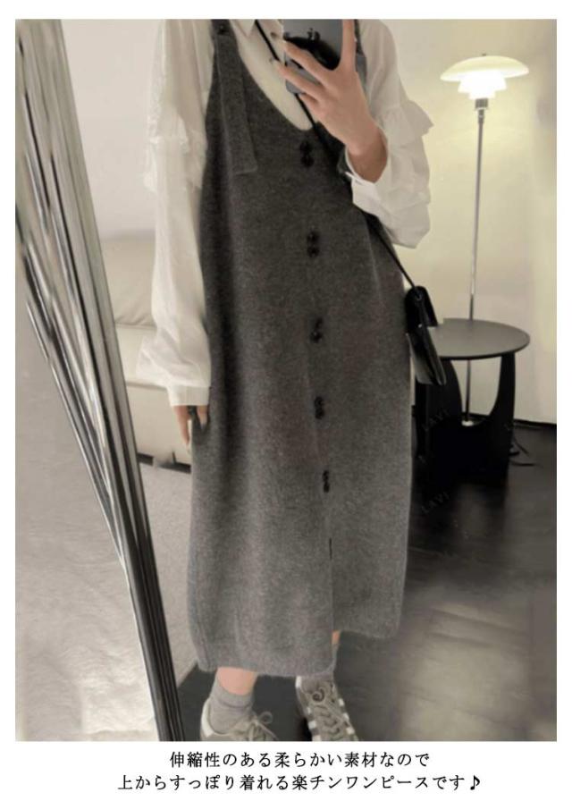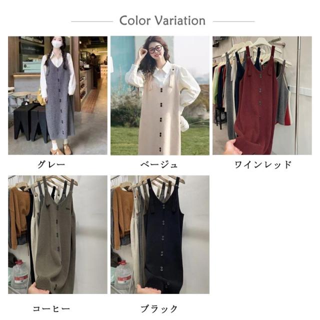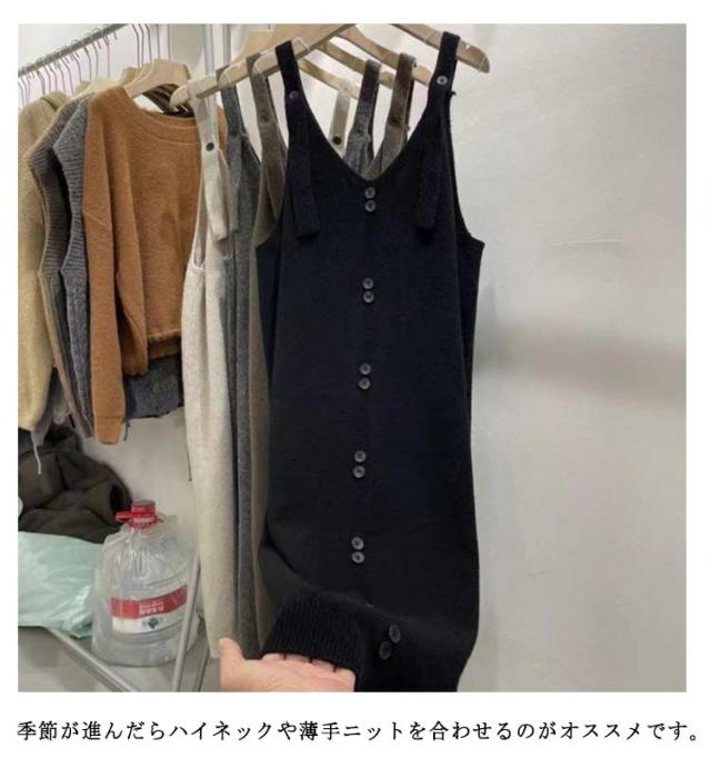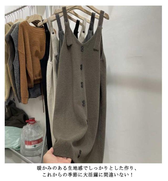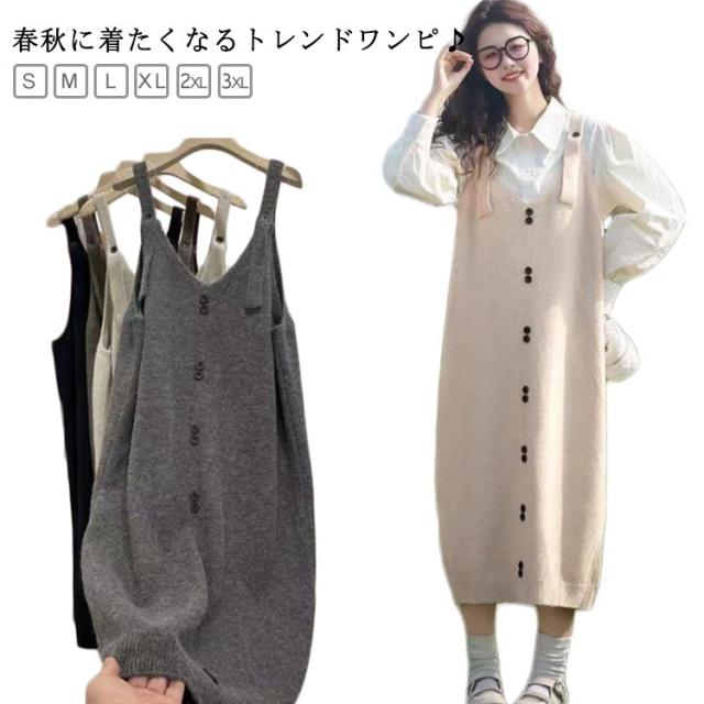 ロング丈 Vネック ニット サロペットスカート ジャンスカ かわいい 送料無料 レディース ワンピ ノースリーブ 送料無料 ジャンパースカート タンクワンピース ボタン飾り 重ね着 大人 オールインワン 無地 カジュアル ゆったり 体型カバー マタニティ 春 秋