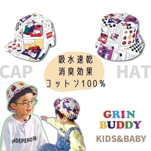 GRIN BUDDY イラスト キャップ ハット ベビー キッズ 50〜54cm 野球帽 バケットハット CAP HAT 子供用 男の子 女の子 綿100% おしゃれ 吸水速乾 消臭効果 紫外線対策 UVケア 日よけ 春 夏 秋 オールシーズン 帽子 グリンバディ NG-5674 NL-5719