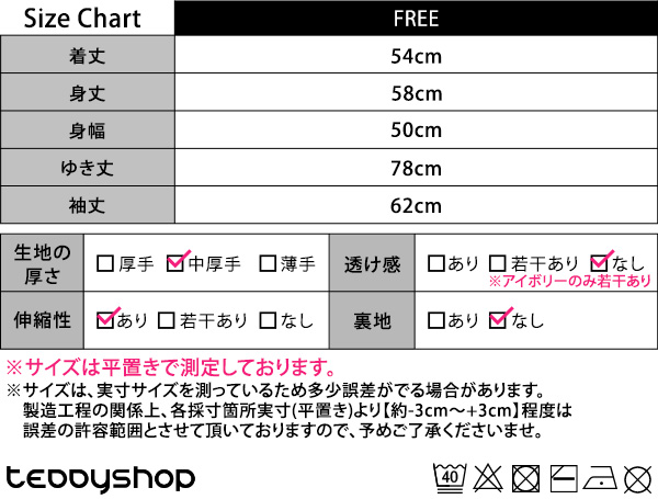 製造工程の関係上、各採寸箇所実寸(平置き)より【約-3cm〜+3cm】程度は