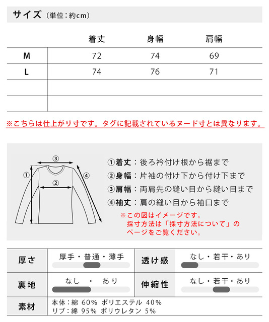| (本体)綿60% ポリエステル40% (リブ)綿95% ポリウレタン5% |