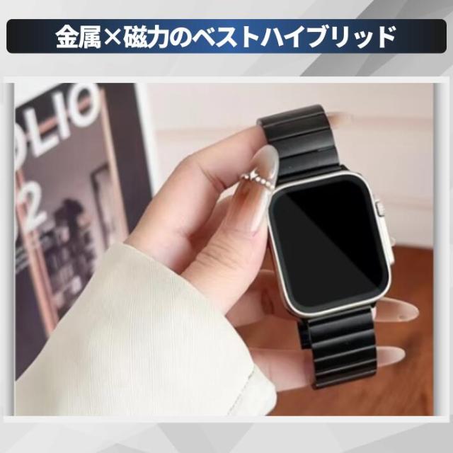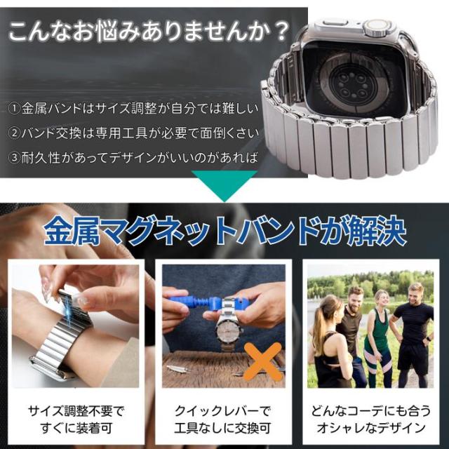 マグネット吸着式でサイズ調整が不要、手首にフィットしやすく、軽量で快適な着け心地を提供。日常使いからフォーマルな場面まで、幅広いシーンで活躍するシンプルかつ洗練された交換バンドです。
