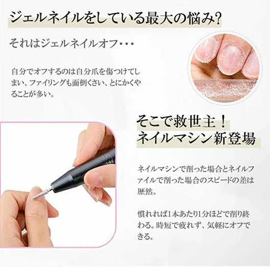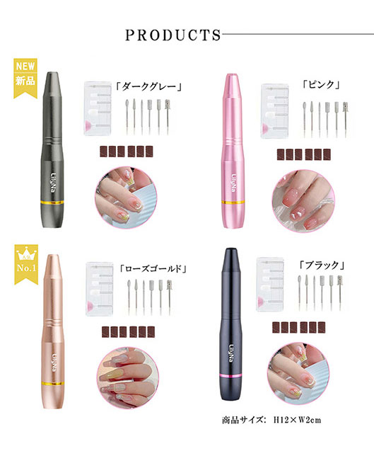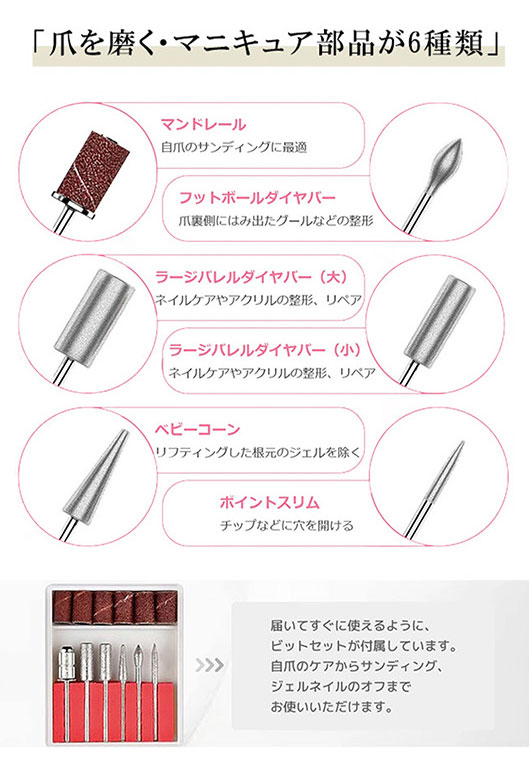 11個の交換可能なビットと6個のサンディングバンドを付属しており、爪の下準備、研磨、カット、ネイルカービング、角質の除去などでご使用いただけます。ご自宅ネイルやネイルサロンではこちらのネイルマシンセットがあれば十分です。
