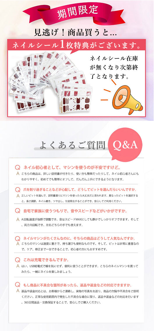 セット内容:ネイルマシン本体×1点、取扱説明書×1点、コントローラー付き通電ケーブル×1点、研磨ビット×6点、サンディングバンド×6点、ドリルビット×5点。