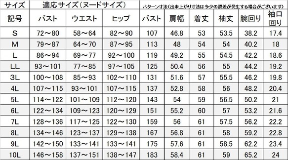 7L〜10L3Lサイズ(パターン上サイズの為、出来上がりに多少の誤差はございます。)