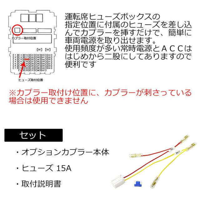![]() 電源を、どなたでも簡単に取り出せる電源取り出しカプラーです。 ヒューズボックスから常時電源、ACC、の電源取り出し(通常デッキ裏や、ヒューズから電源をとります)が、このカプラーをヒューズボックスのカプラーに挿し付属のヒューズを差し込むだけで電源を取り出せます。 電源を取るのにデッキを外す必要もありませんし、検電テスターを当てて電源を探す必要もありません。 電装品の取付には欠かせない一品です。 後々の配線の接続を考えまして、ワンタッチのギボシを取り付けてありますので配線接続も楽チン♪です。 使い方は無限大!!ETCの取り付けやドライブレコーダー・レーダーの電源取りなどに大活躍です 商品詳細 内容物 ・オプションカプラー本体 ・ヒューズ 15A ・取り付けマニュアル 作業時間目安・・・約5〜10分 ☆取得可能電源☆ 常時電源・・・常に電源(バッテリー電圧)を示します。 ACC・・・キーを1回、回した時にバッテリー電圧を示します。 |