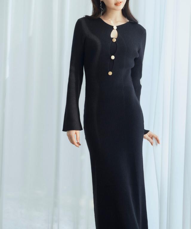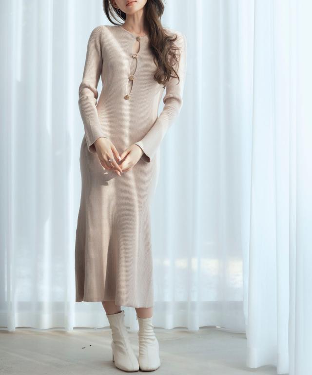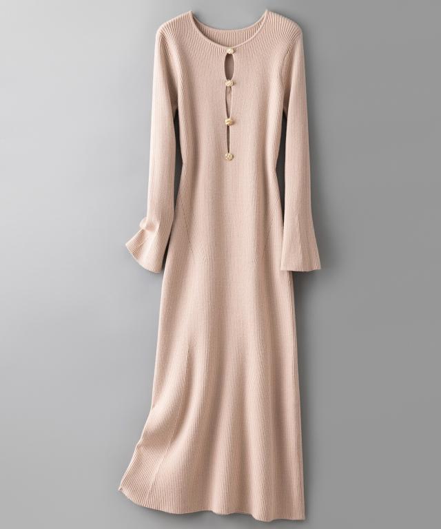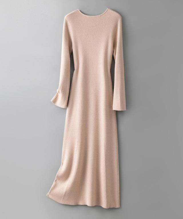 エレガントなラインを描くタイトシルエのミモレ丈ニットワンピース。