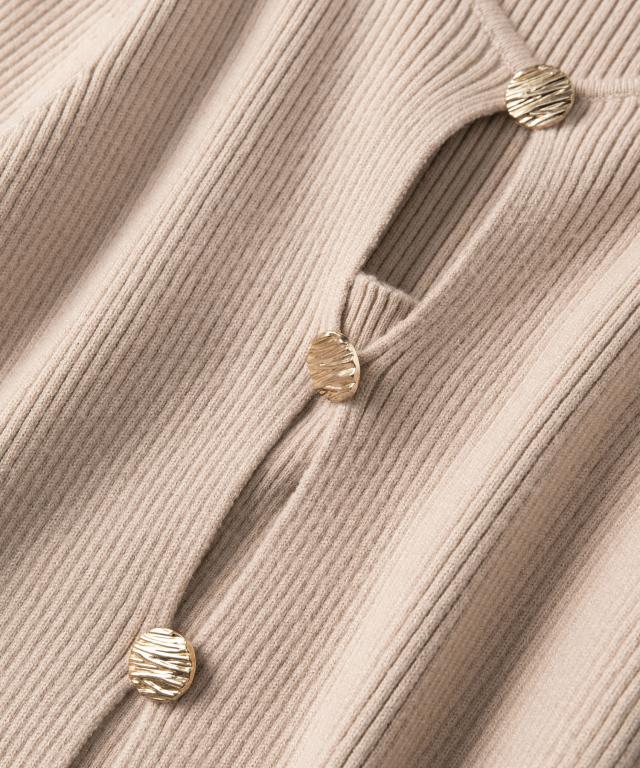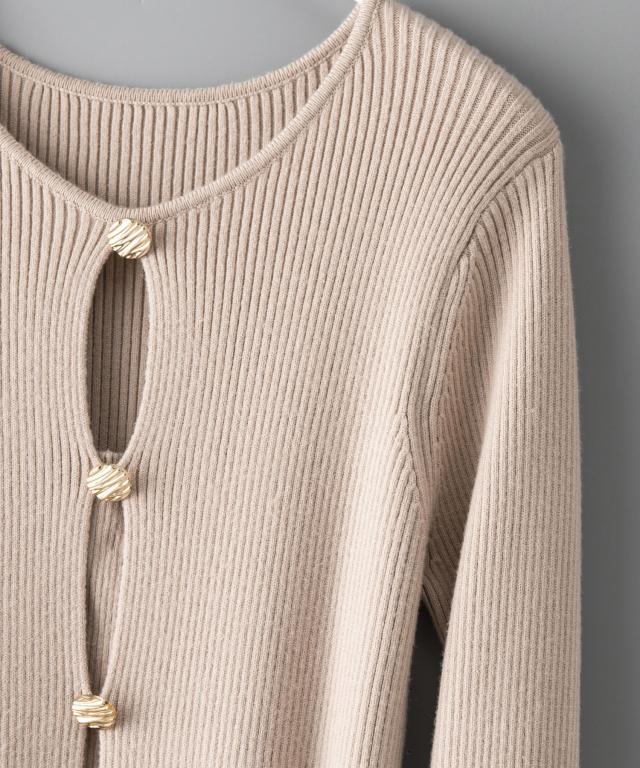 首元は上品なクルーネックで、大き目のフロントボタンがデザインのアクセントに。第一ボタンと第二ボタンの隙間からほんのり肌見せすることでセンシュアルな抜け感をオンします。