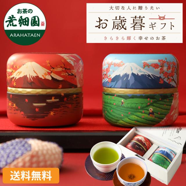 お歳暮 ギフト 富士暦缶 2本箱入 静岡茶 お茶 静岡茶 茶葉 ギフト 富士山 赤富士 青富士 縁起物 人気 緑茶 ほうじ茶 送料無料 実用 50代 60代 70代 80代 深蒸し茶 日本茶 お茶葉 お茶缶 agesugi_sgu
