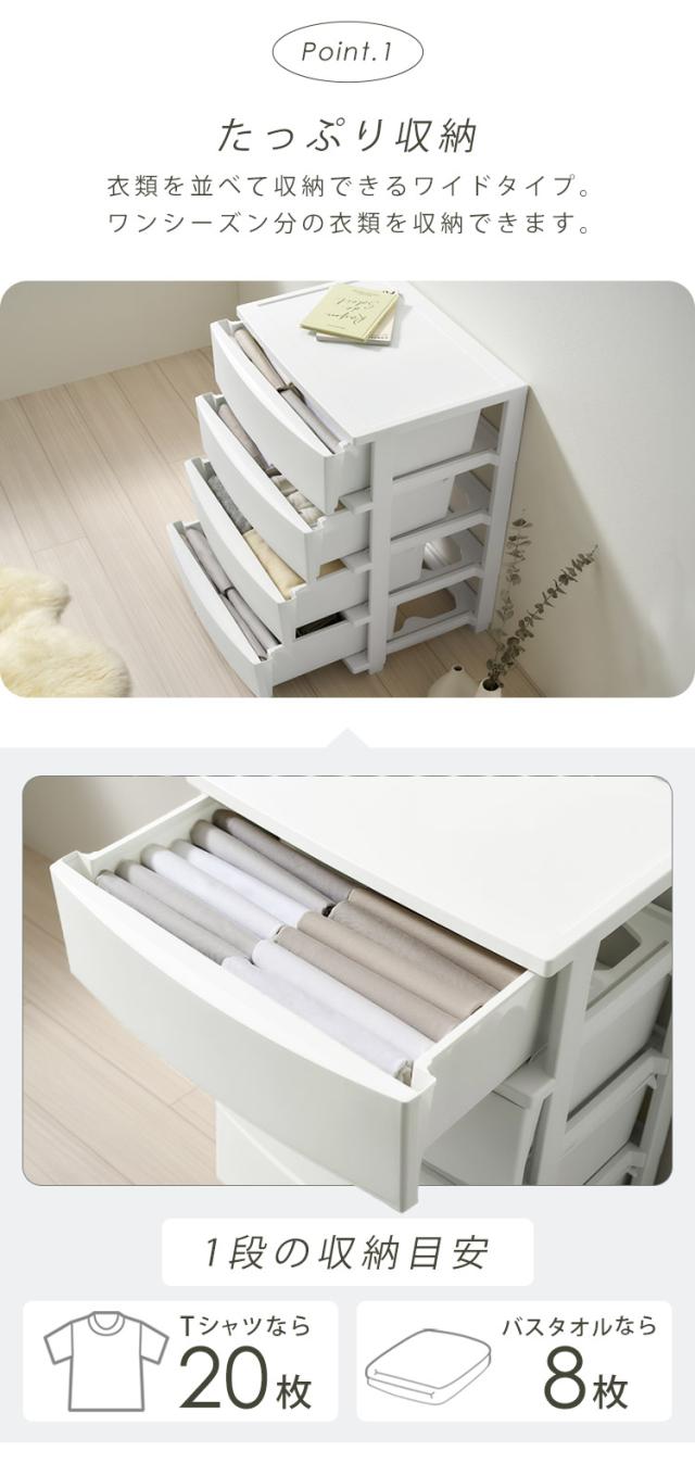 収納目安(引き出し1段あたり)は「Tシャツ:約20枚」または「バスタオル:約8枚」。
