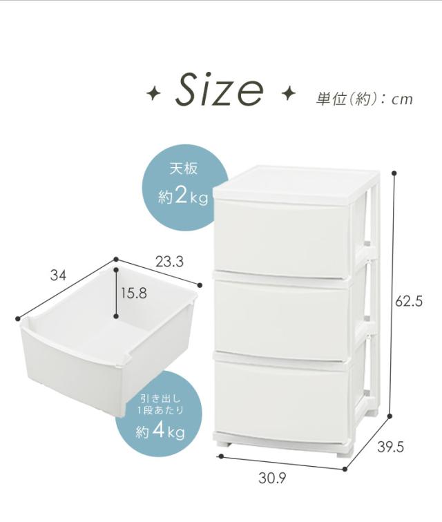 収納目安(引き出し1段あたり)は「Tシャツ:約8枚」または「バスタオル:約2枚」。