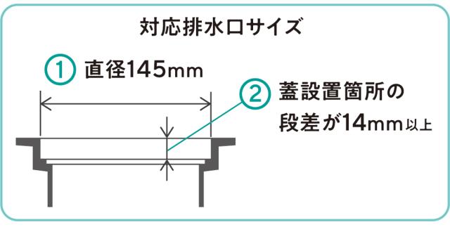 | 注意事項 | ※設置可能条件:排水口の直径が145mm、かつ蓋設置個所の段差が14mm以上 ※漂白剤使用不可 |