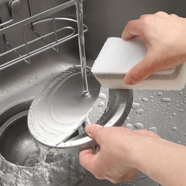 銅配合のステンレス素材でぬめりを軽減します。また、お手入れしやすいシンプルなデザインで食洗機にも対応しています。