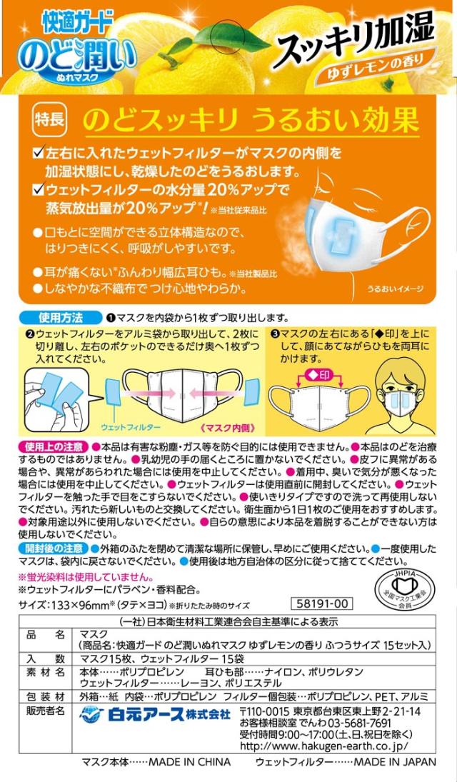 快適ガード のど潤いぬれマスク ゆずレモンの香り ふつうサイズに関する詳細なお問合せは下記までお願いします