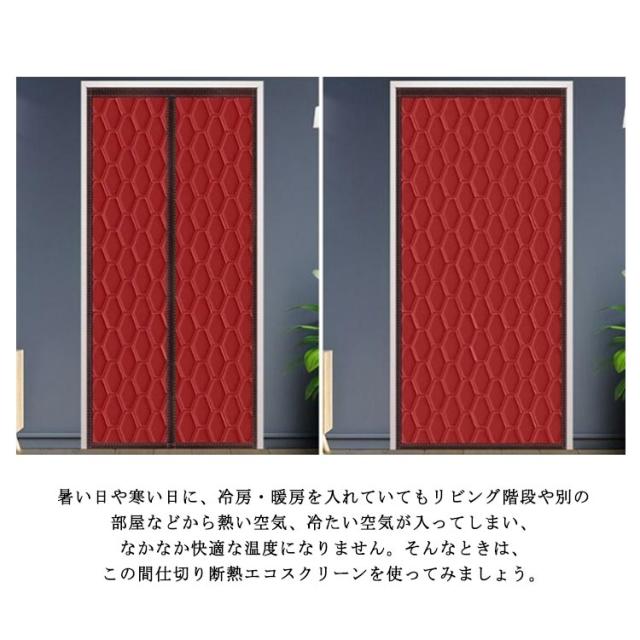 | 冬は暖房効率アップ!間仕切りの保温・防寒ドアカーテン。 暑い日や寒い日に、冷房・暖房を入れていてもリビング階段や別の部屋などから熱い空気、冷たい空気が入ってしまい、なかなか快適な温度になりません。そんなときは、この間仕切り断熱エコスクリーンを使ってみましょう。 中綿入りなので、冷風の侵入を防ぎ、部屋の温度も守ります。 真ん中はマグネット式なので、自動的に開閉ことができます。 面倒な工事が不要、女性の方でも簡単に操作できます。 断熱機能が空調効率をアップさせ、オールシーズン省エネ効果で電気代の節約できます。 | |