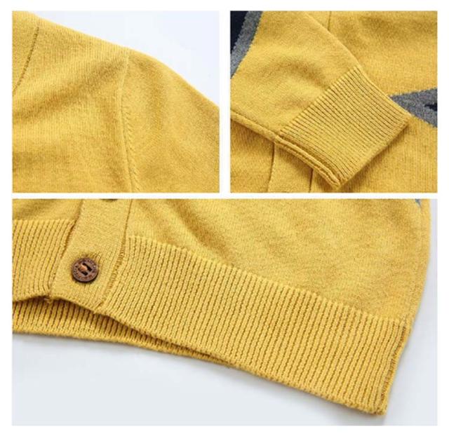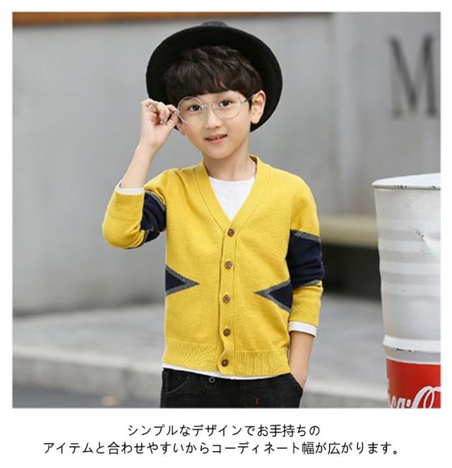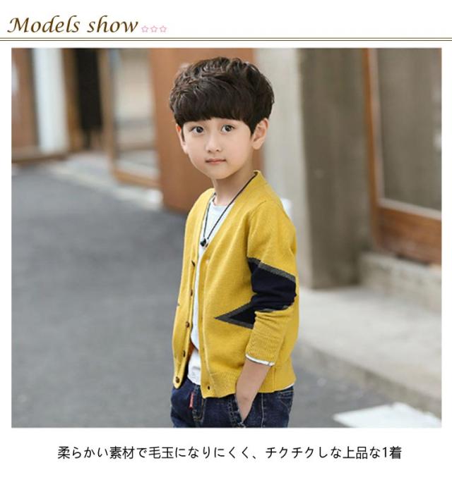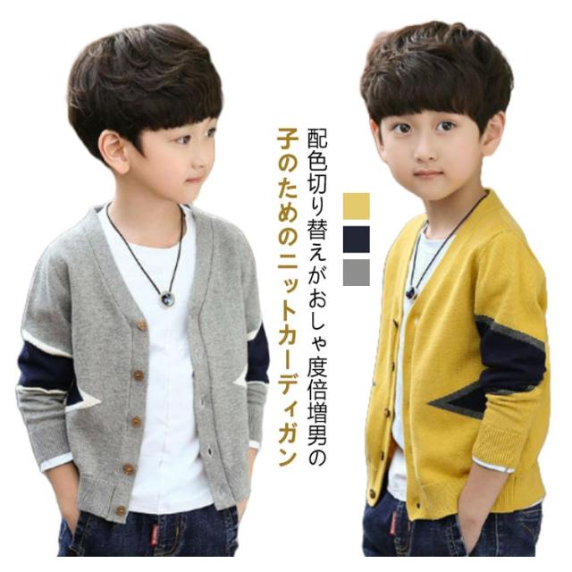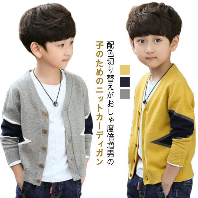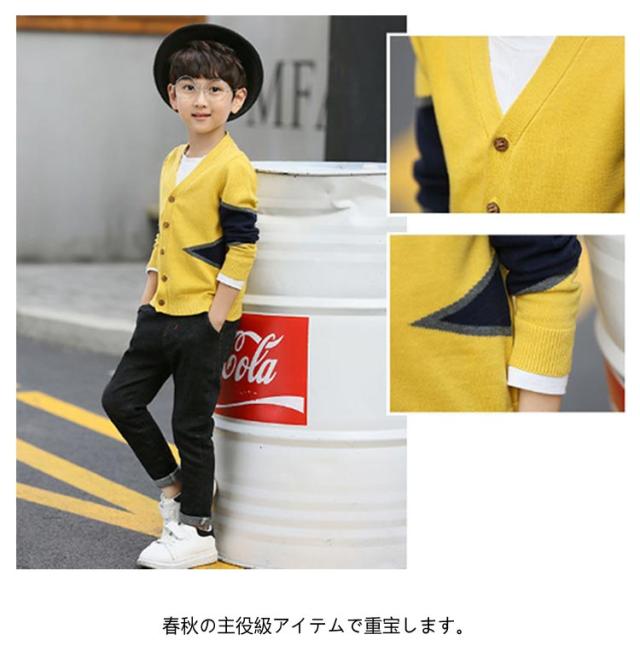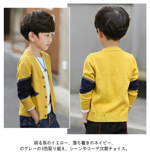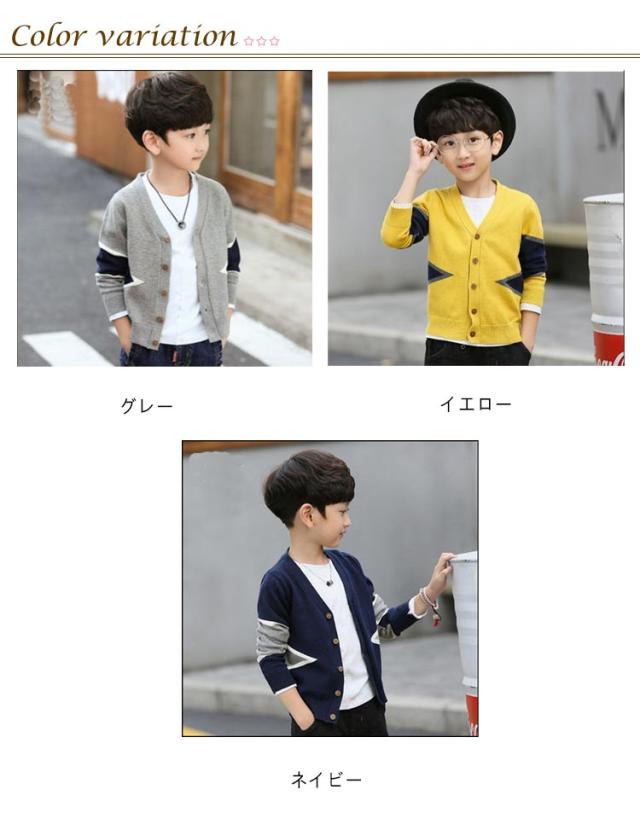 | 配色切り替えがおしゃ度倍増♪男の子のためのニットカーディガン 柔らかい素材で毛玉になりにくく、チクチクしな上品な1着♪ シンプルなデザインでお手持ちのアイテムと合わせやすいからコーディネート幅が広がります。 春秋の主役級アイテムで重宝します。 明る系のイエロー、落ち着きのネイビー、のグレーの3色取り揃え、シーンやコーデ次第チョイス。 | |
