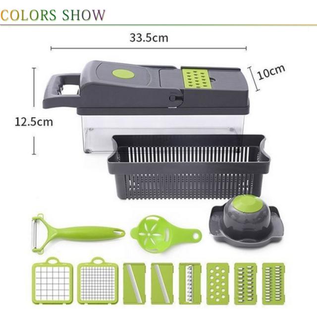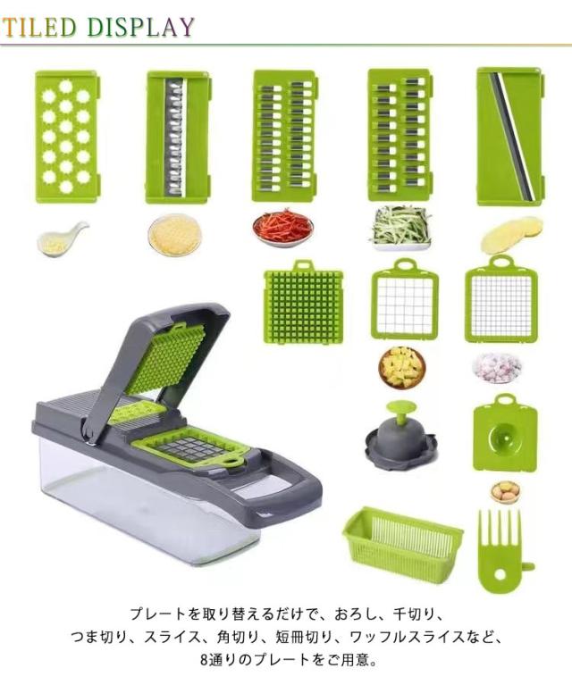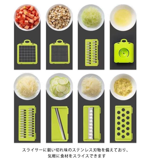 | 下ごしらえの時間を大幅短縮する多機能キッチンスライサーセットです。 プレートを取り替えるだけで、おろし、千切り、つま切り、スライス、角切り、短冊切り、ワッフルスライスなど、8通りのプレートをご用意。 この野菜カッターは全ての部品を分解し、丸洗いが可能で、細かい部分までしっかり洗い流せるので便利で衛生的です、 底部には水切りバスケットがあるので、切った野菜をバスケットに浸して、掃除の仕上げにつまむことができます。 安全ホルダーで小さくなった野菜を掴めることで、手を切る心配まったくないで、安全にスライスできます。 スライサーに鋭い切れ味のステンレス刃物を備えており、気軽に食材をスライスできます | |