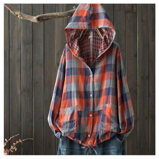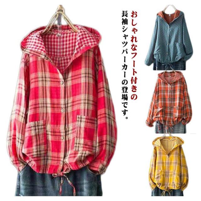 パーカー レディース ライトアウター 春服 チェック ロングシャツ フード付き チェック柄 長袖 トップス アウター シャツ 秋服 パーカー 大きいサイズ ゆったり 羽織り 体型カバー 綿 ポケット付き