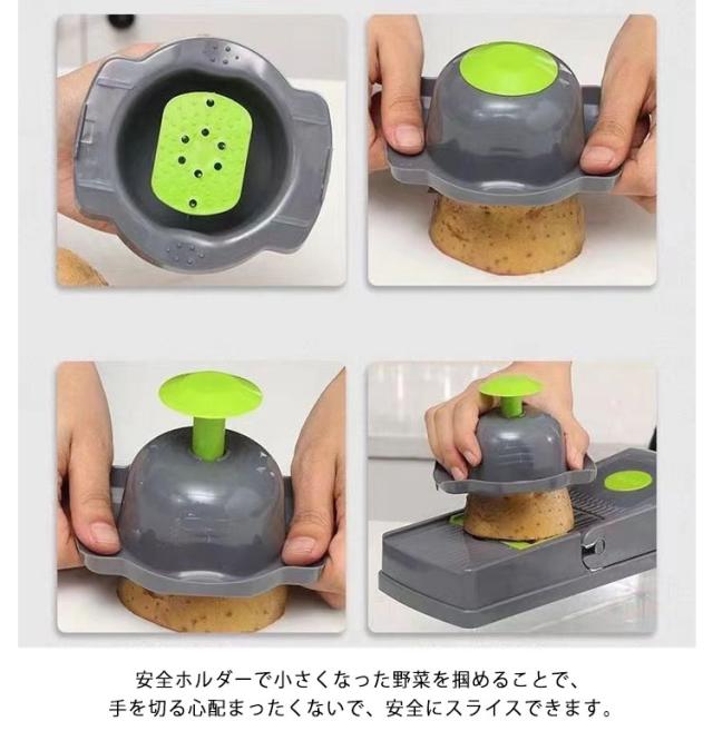 | 下ごしらえの時間を大幅短縮する多機能キッチンスライサーセットです。 プレートを取り替えるだけで、おろし、千切り、つま切り、スライス、角切り、短冊切り、ワッフルスライスなど、8通りのプレートをご用意。 この野菜カッターは全ての部品を分解し、丸洗いが可能で、細かい部分までしっかり洗い流せるので便利で衛生的です、 底部には水切りバスケットがあるので、切った野菜をバスケットに浸して、掃除の仕上げにつまむことができます。 安全ホルダーで小さくなった野菜を掴めることで、手を切る心配まったくないで、安全にスライスできます。 スライサーに鋭い切れ味のステンレス刃物を備えており、気軽に食材をスライスできます | |