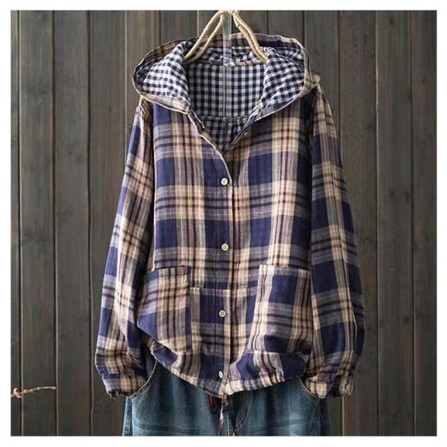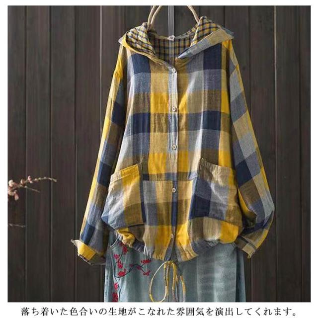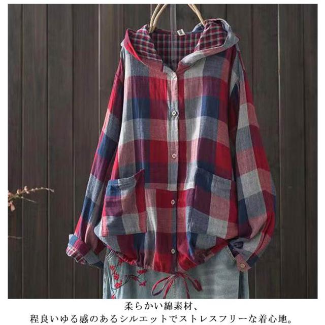 ライトアウター チェック柄 パーカー 長袖 ボタンパーカー レディース ゆったり チェック アウター トップス フード付き シャツ 秋服 春服 大きいサイズ パーカー 羽織り 体型カバー 綿 ポケット付き