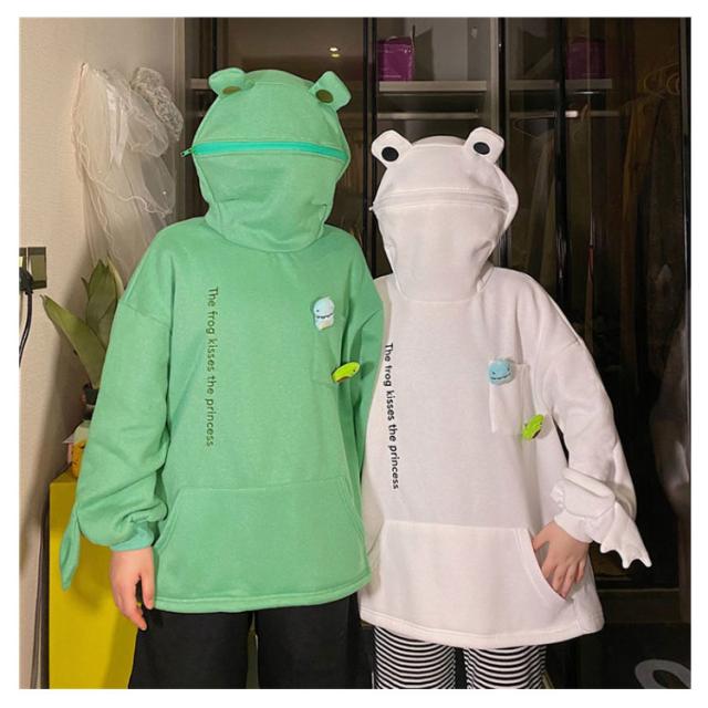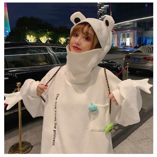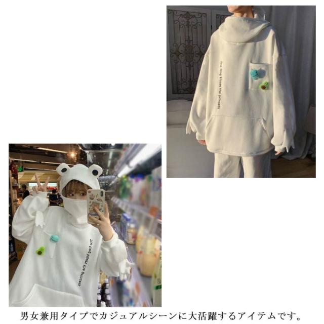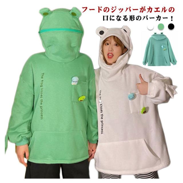 カエル 蛙 パーカー メンズ トップス レディース 面白い 裏起毛 ユニセックス かえる プルオーバー カエル トップス フード付き ジッパー付き ゆったり 秋服 秋冬 ホワイト ブラック
