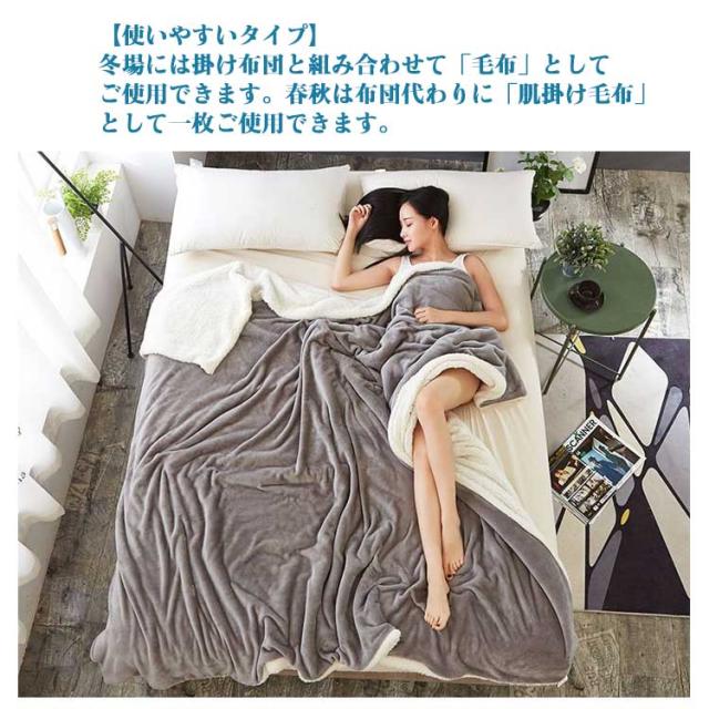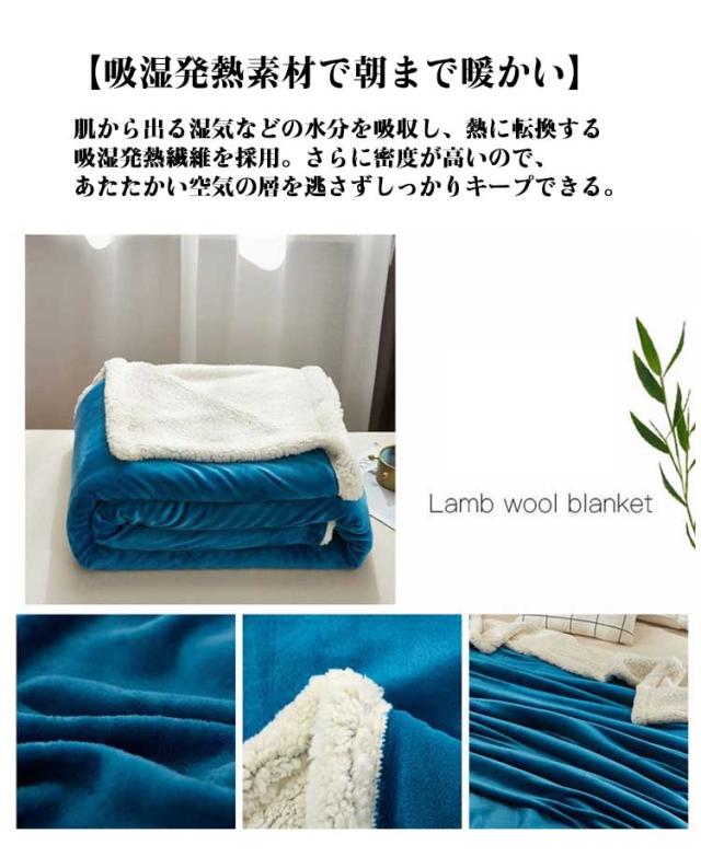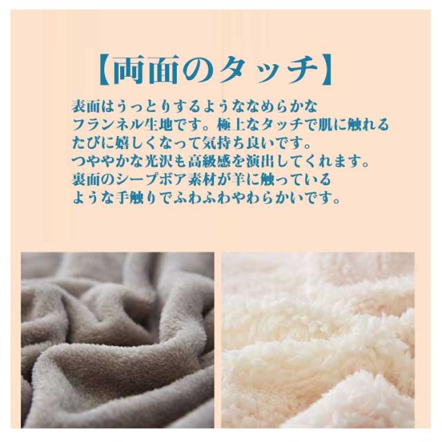 | 【両面のタッチ】表面はうっとりするようななめらかなフランネル生地です。極上なタッチで肌に触れるたびに嬉しくなって気持ち良いです。つややかな光沢も高級感を演出してくれます。裏面のシープボア素材が羊に触っているような手触りでふわふわやわらかいです。繊維自体が発熱してくれるから、カラダを毛布で包んだ瞬間からふんわりあったか。もこもこの長い毛足に空気をため込み、暖かさを逃しません。 【吸湿発熱素材で朝まで暖かい】肌から出る湿気などの水分を吸収し、熱に転換する吸湿発熱繊維を採用。さらに密度が高いので、あたたかい空気の層を逃さずしっかりキープできる。 【静電気防止】静電気防止加工が施されているのが、乾燥した冬には嬉しいポイントです。 【使いやすいタイプ】冬場には掛け布団と組み合わせて「毛布」としてご使用できます。春秋は布団代わりに「肌掛け毛布」として一枚ご使用できます。夏場にはエアコンをつけて寝る人も多いと思いますが、冷房対策や寝冷え防止に使うのも適しています。 | |