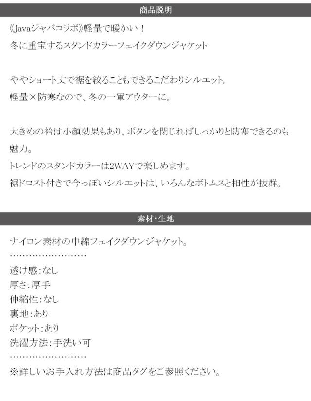 ★《Javaジャバコラボ》軽量で暖かい!冬に重宝するスタンドカラーフェイクダウンジャケット★