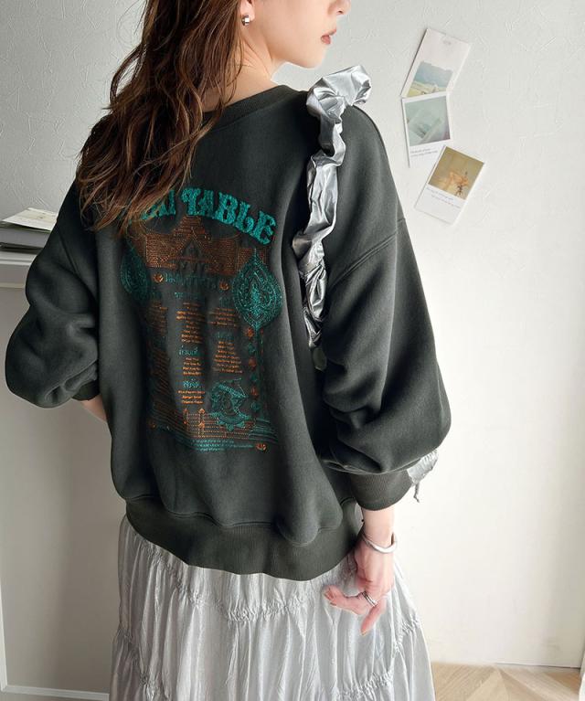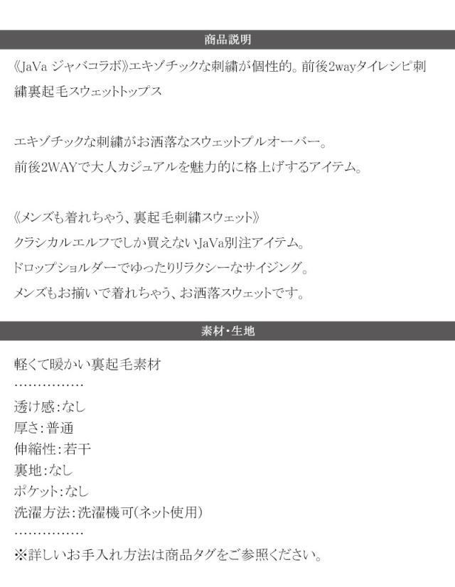 ★《JaVa ジャバコラボ》エキゾチックな刺繍が個性的。前後2wayタイレシピ刺繍裏起毛スウェットトップス★