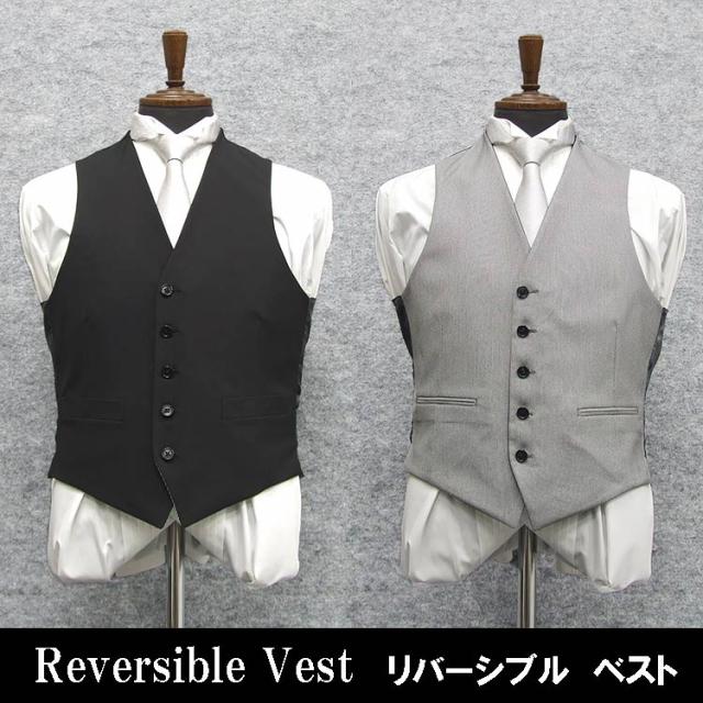 フォーマルスーツやブラックスーツとコーディネイトして気軽にドレスアップできるリバーシブルフォーマルベスト