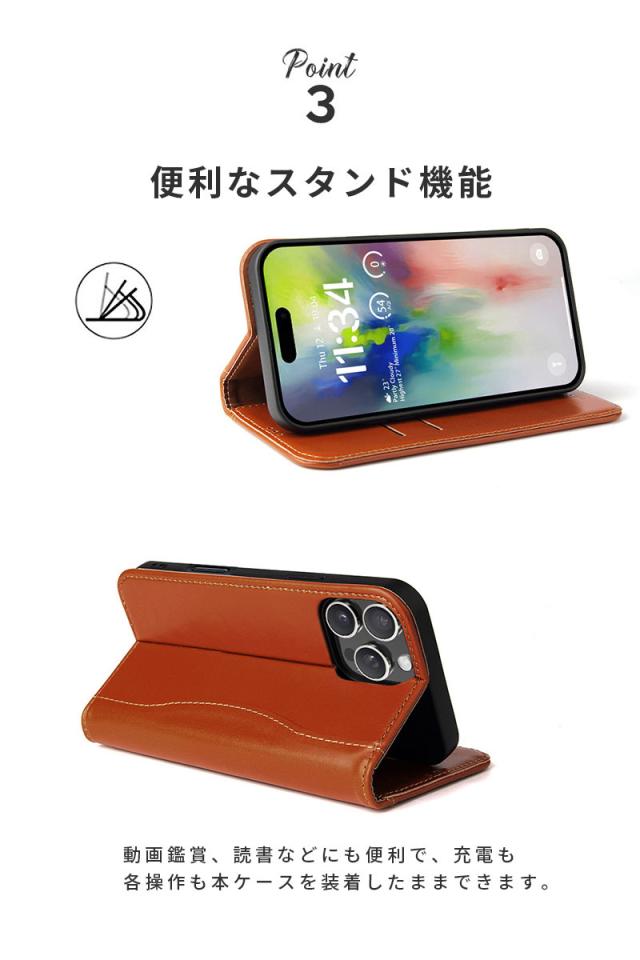 | ・厳選された本革 高級本革を丁寧に使用し、革本来の手ざわりの良い質感を持ち合わせています。 ・便利なスタンド機能 ケースに横置きスタンド機能が付いているので、手に持たず動画の視聴などを楽しむことができます。 ・ソフトなインナー インナーケースは柔らかくて丈夫なTPUを使用しており、しっかり端末を守ります。 |