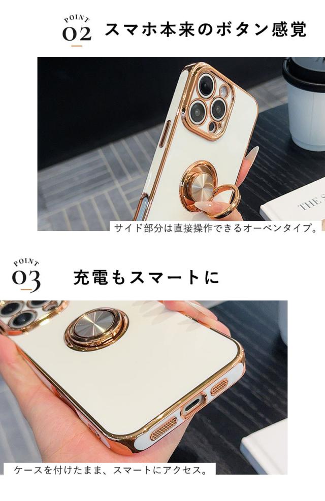 | ・スマホリング 背面にはスマホスタンドとしても使えるスマホリングも付いており、デザイン性だけでなく、機能性もばっちりです。 ・やわらかなマイクロファイバー 裏地はマイクロファイバーなのでケースが擦れてiPhone本体を傷つける心配はありません。 ・快適な操作性 ボタン部分はケースの上でも押しやいように作成しています。 ・カメラレンズ保護 傷つきやすいカメラ周りは、レンズより少し高さを設けたデザインになっているので安心です。 |
