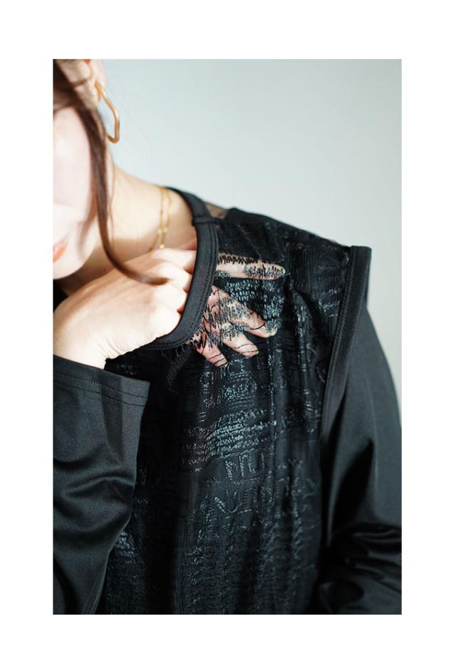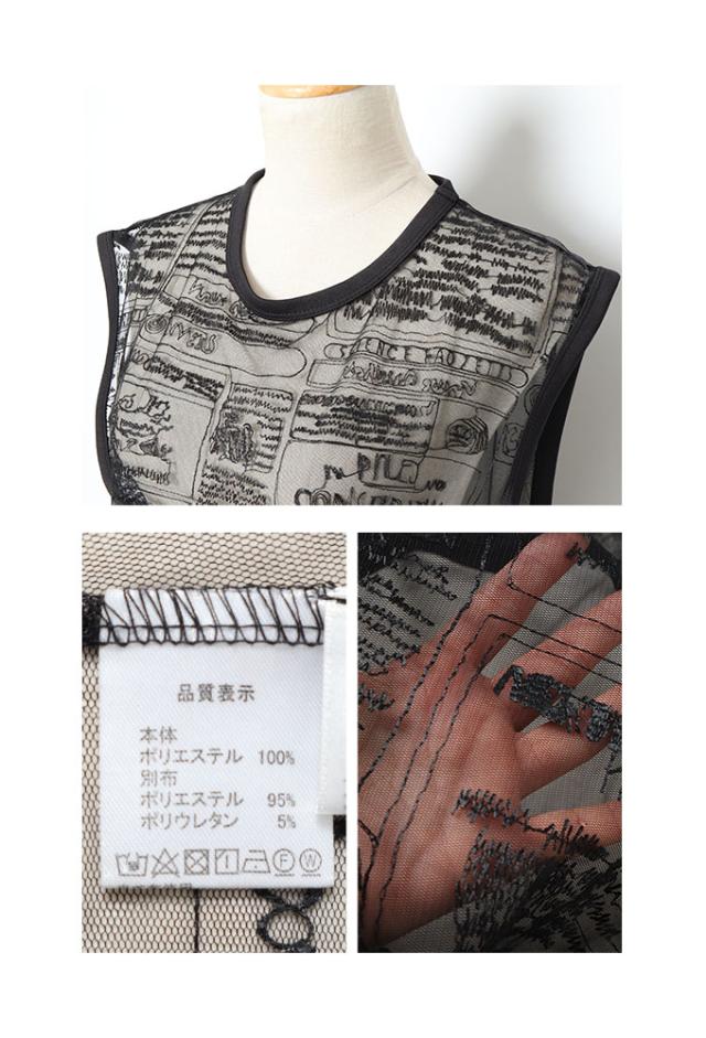 中のワンピースの着丈は膝くらいです。首元は鎖骨が半分見えるくらいのラウンドネックです。袖は手の甲が隠れるくらいです。脇グリも身幅もとても余裕があり楽に着用出来ました。ふんわり広がるAラインのシルエットで体型を拾いませんり伸縮性のある柔らかい生地で肌触りも良かったです。上のチュールベストの着丈はおしりが半分隠れるくらいです。脇グリは広く身幅も余裕がありました。柔らかいチュールに筆記体などかま描かれたデザインでインナー次第で楽しめそうです。