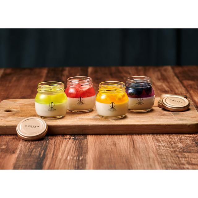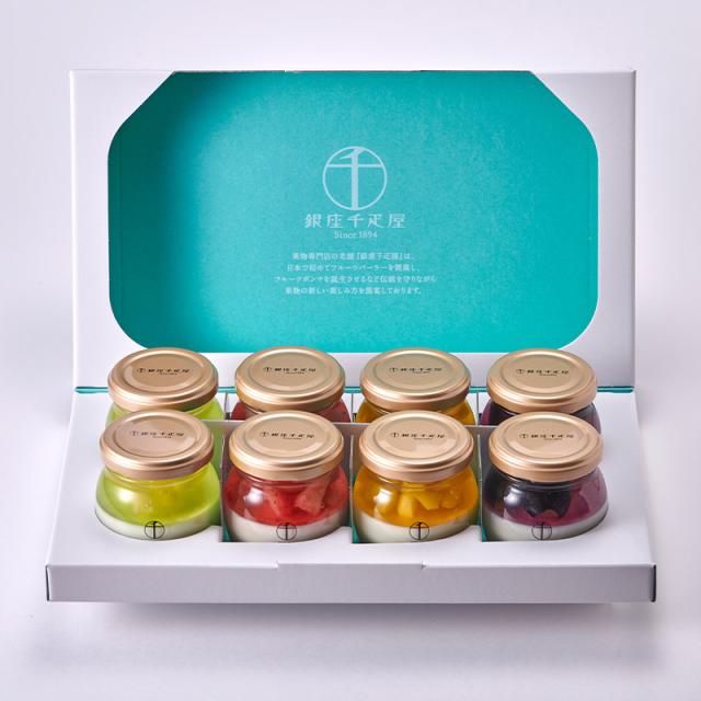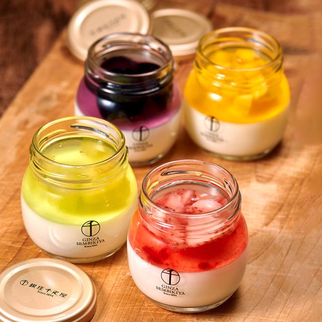フレッシュな果物を使用した4種類のフルーツゼリーと口当たりなめらかな杏仁豆腐を瓶に閉じ込めました。