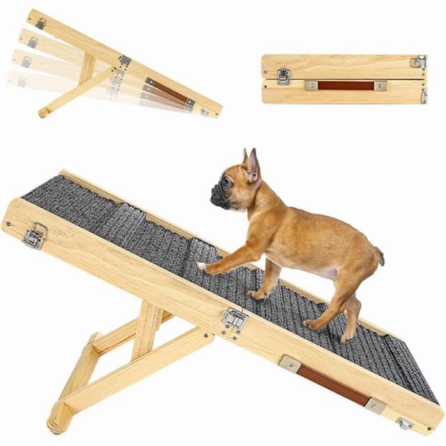 「高さ4段階調節」 本製品の高さは20cm、35cm、40cm、45cmの4段階調節ができます。使用場所の高さによって、自由に、便利に調節可能です。初めてご利用の場合は、まずは折りたたんでフラットな状態でペットを歩かせて不安を取り除いでから、高さを徐々に上げてください。「折り畳み式収納」 折り畳み式デザインで、使用しないときは42cm*32cm*14cmまで収められ、ベッドやソファーの下、又は車のトランクに入れて収納でき、必要な時にはすぐに取り出せて、手軽に展開できます。「ペットにやさしい素材」 製品の全体は上質で頑丈な天然木材を採用し、ペットの日常の上り下りによる重量に耐えられ、長時間ご利用いただけます。表面にはポリプロピレン繊維で作り上げたマットを敷いて、強度がありワンちゃんの爪に耐えられ、優れた滑り止め性能を持っています。