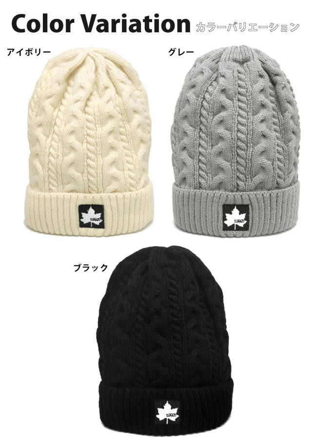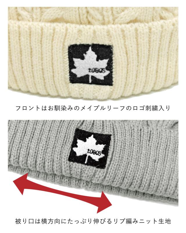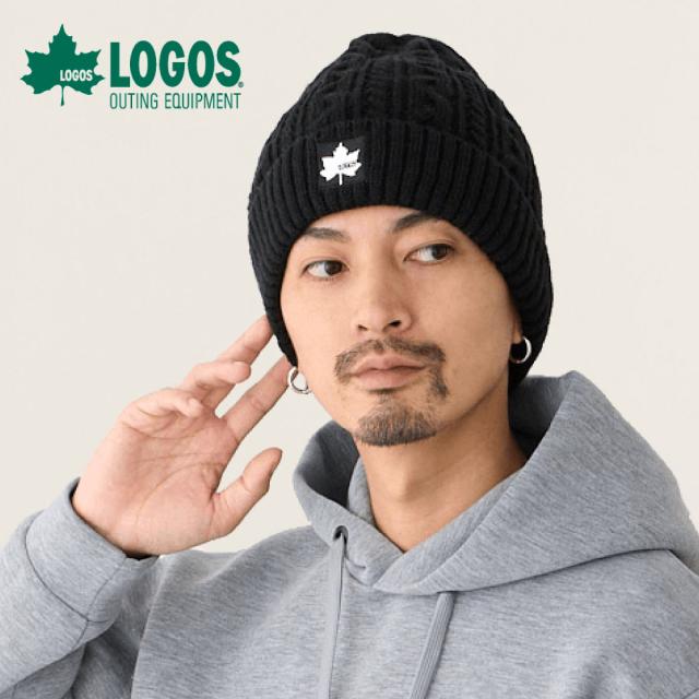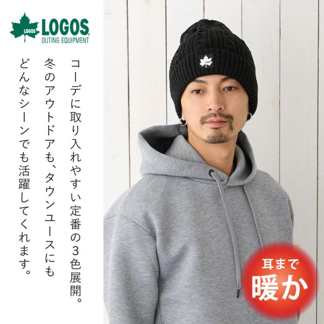 LOGOSのケーブル編みニット帽は、秋冬の寒さから耳までしっかり守ります。