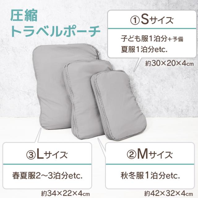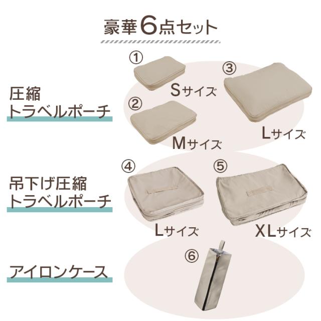 | 内容 | 圧縮トラベルポーチ【S/M/L】 ×各1 吊り下げ圧縮トラベルポーチ【L/XL】 ×各1 アイロンケース ×1 |
