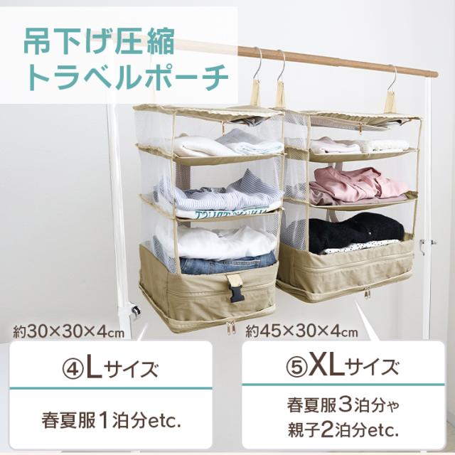 | サイズ | (圧縮トラベルポーチ) S:(約)30×20×15cm M:(約)34×22×20cm L:(約)42×32×20cm (吊り下げ圧縮トラベルポーチ) L:収納時(約)30×30×4cm / 使用時(約)30×30×66cm XL:収納時(約)45×30×4cm / 使用時(約)45×30×66cm ※フック幅:(約)6cm (アイロンケース) (約)縦幅30cm×横幅14cm×マチ5.5cm |