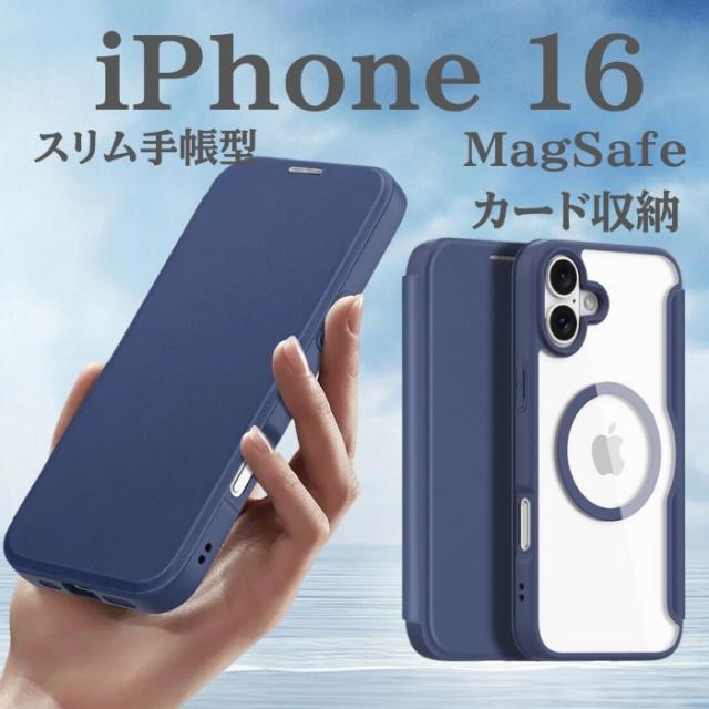 スマホケース iPhone16 iPhone 16 ブルー 青 手帳型 TPU ストラップホール ワイヤレス充電 MagSafe カード収納 高級感 便利 多機能 かっこいい シンプル 男性