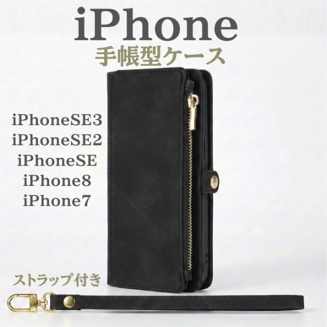 スマホケース iPhone7 iPhone8 iPhoneSE iPhoneSE2 iPhoneSE3 iPhone ブラック 黒 手帳型 TPU ストラップホール 財布 モノトーン 高級感 便利 多機能 かっこいい