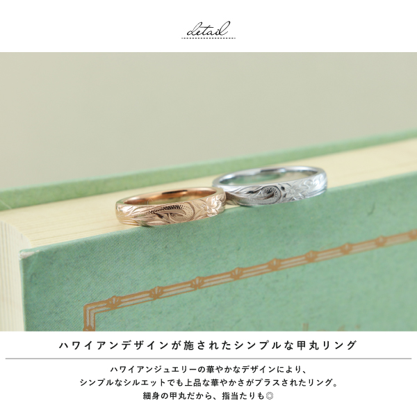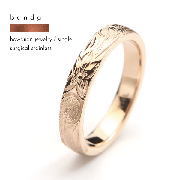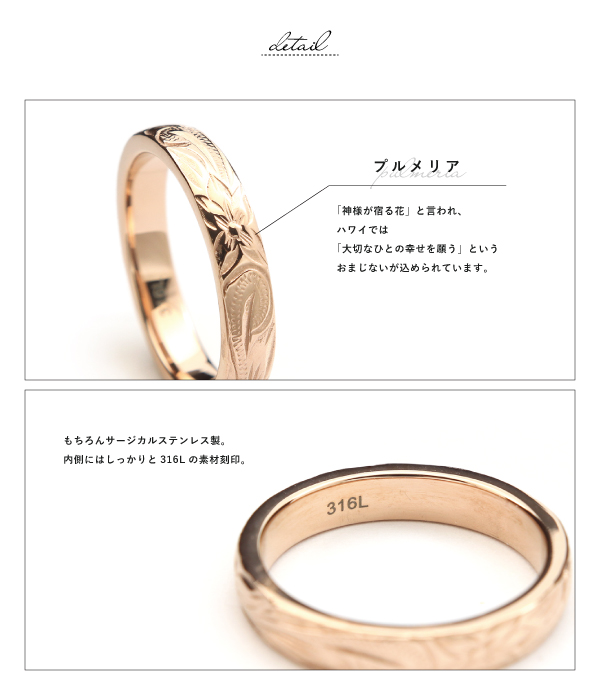 リング つけっぱなし ステンレス サージカルステンレス 医療用ステンレス 金属アレルギー アレルギーフリー 316L ハワイアンジュエリー ハワイ ハワイアン プルメリア 花 細身 シンプル 甲丸 ピンクゴールド 刻印 名入れ メンズ レディース