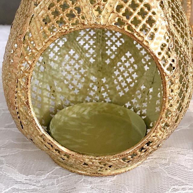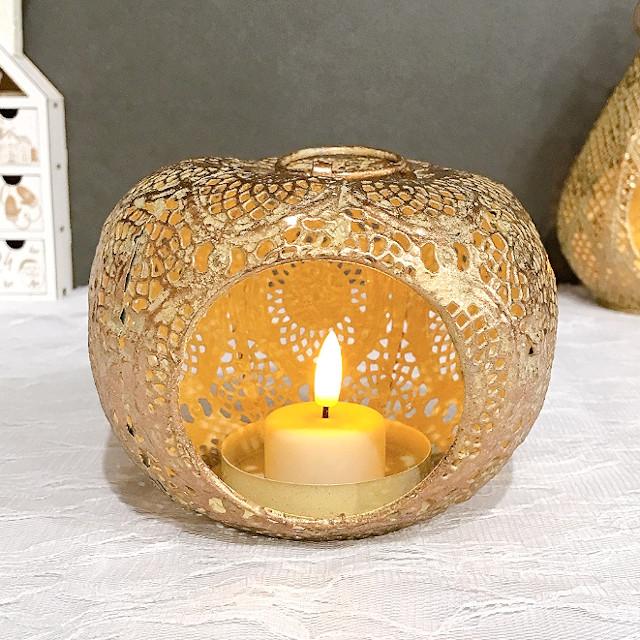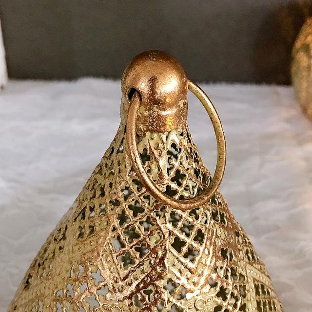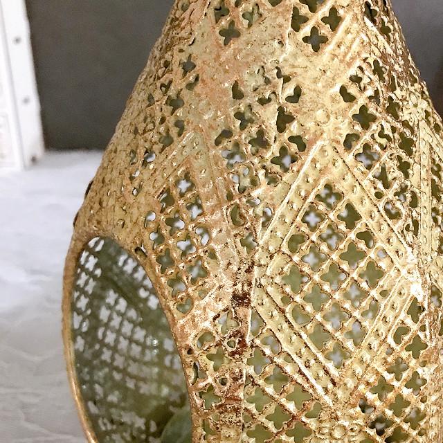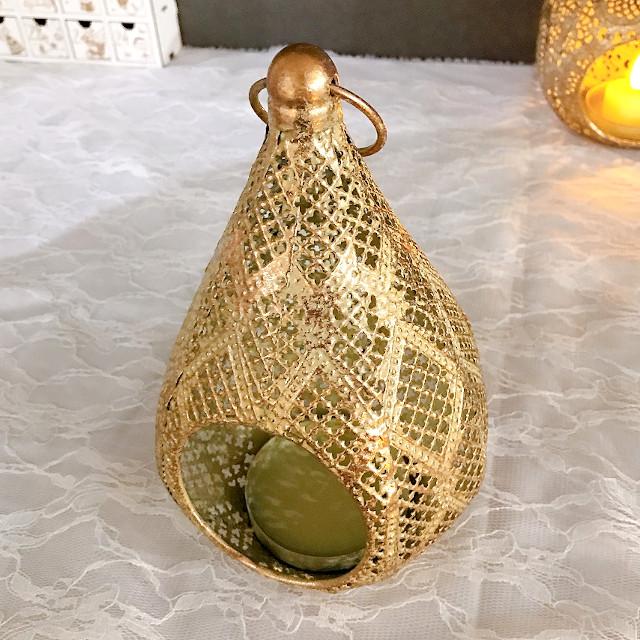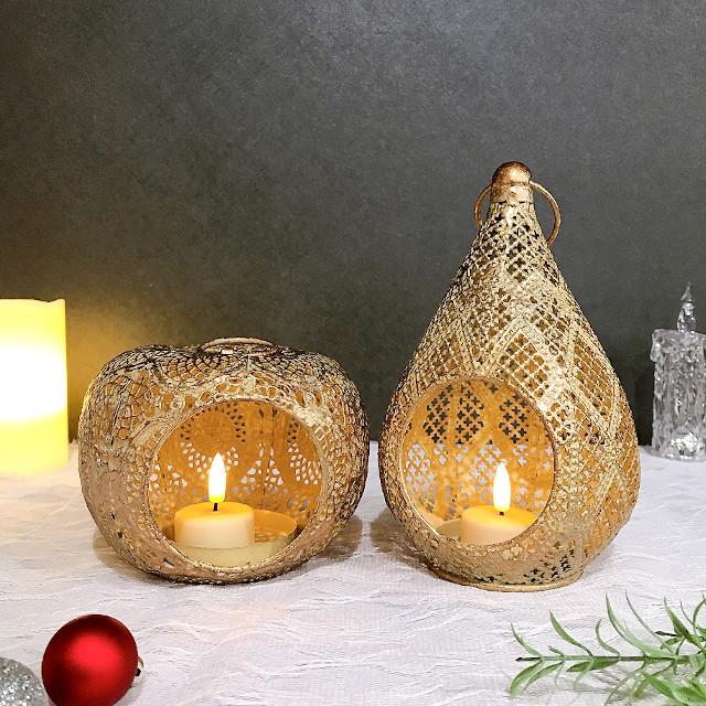 レース柄のメタルでできたエキゾチックな洋ナシ型のLEDキャンドル用ランタン。