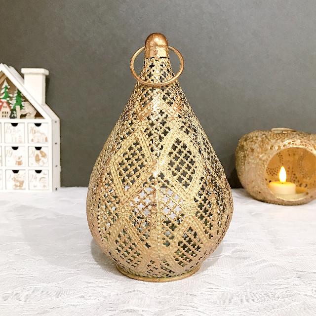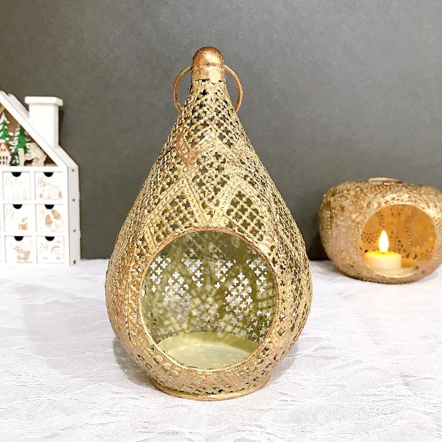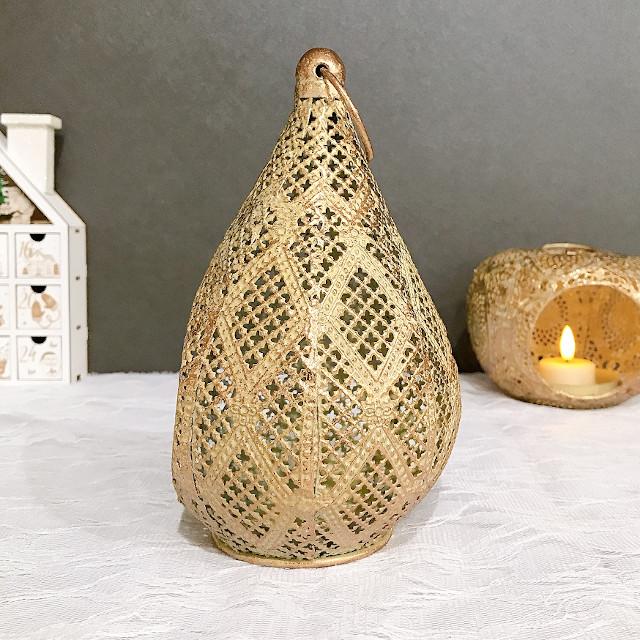 レース柄のメタルでできたエキゾチックな洋ナシ型のLEDキャンドル用ランタン。 |