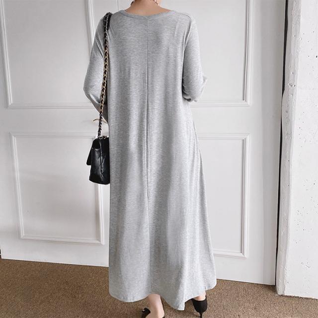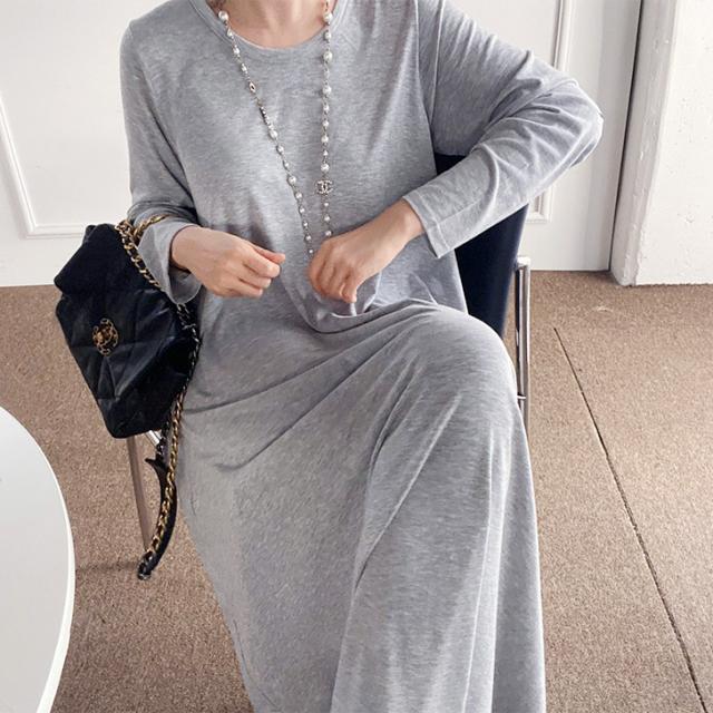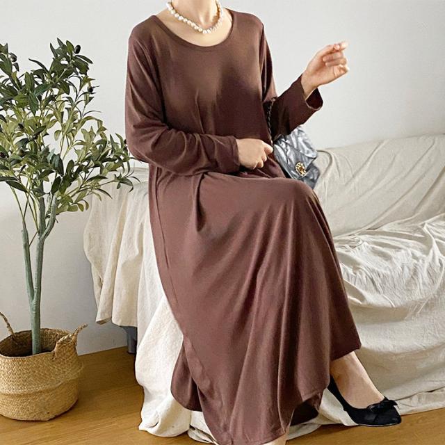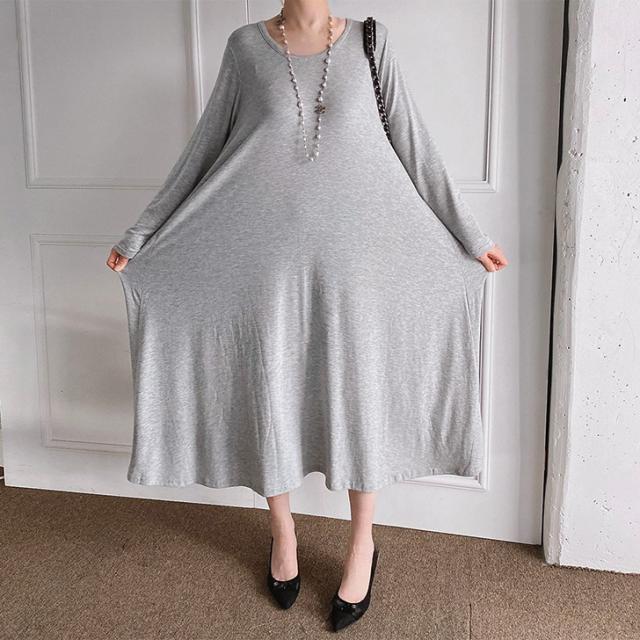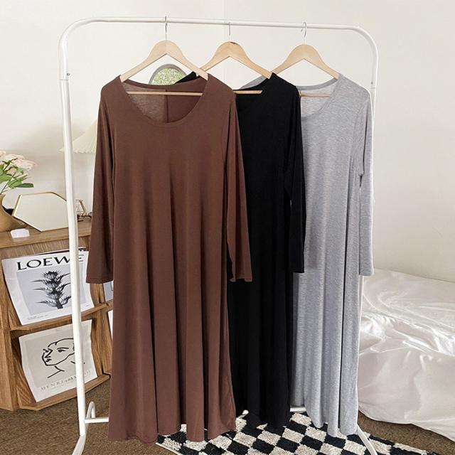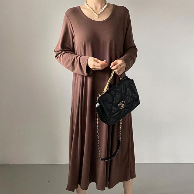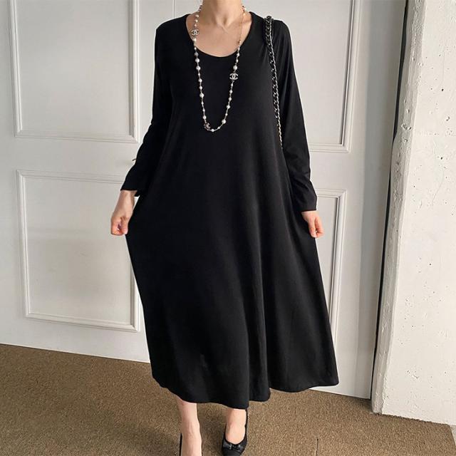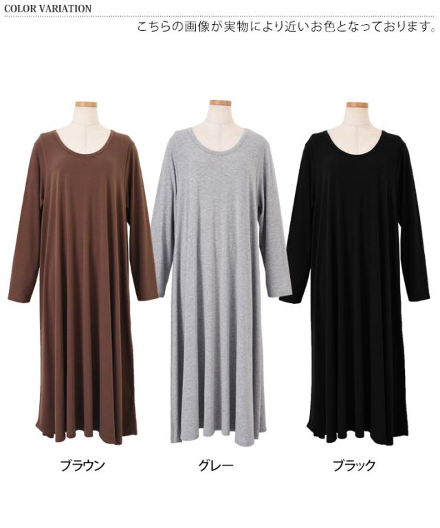 新作 レーヨンブレンドUネックフレアロングワンピース レディース 秋冬 長袖 薄手 高身長 ゆったり 大きいサイズ 体型カバー リラックス 可愛い おしゃれ 無地 ロング丈 マキシ丈 Aライン 丸首 ラウンドネック