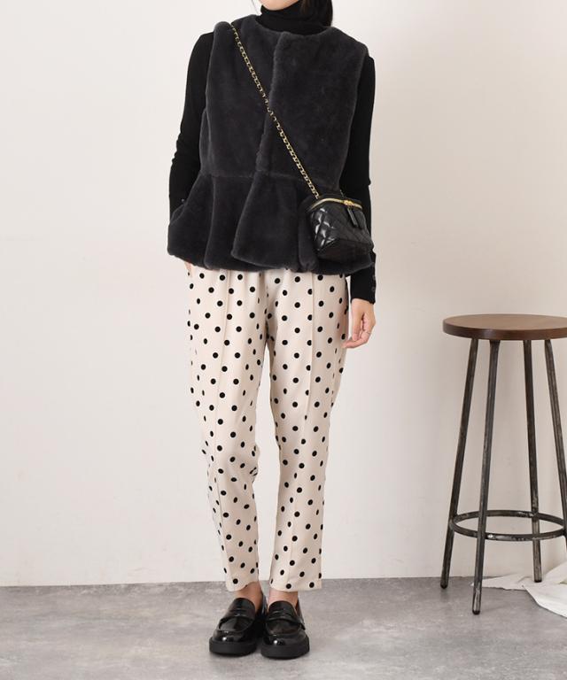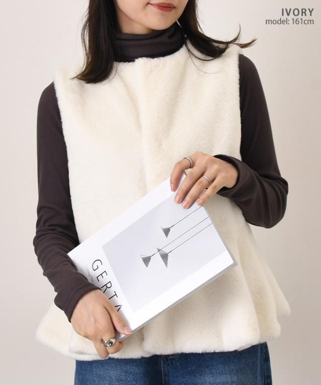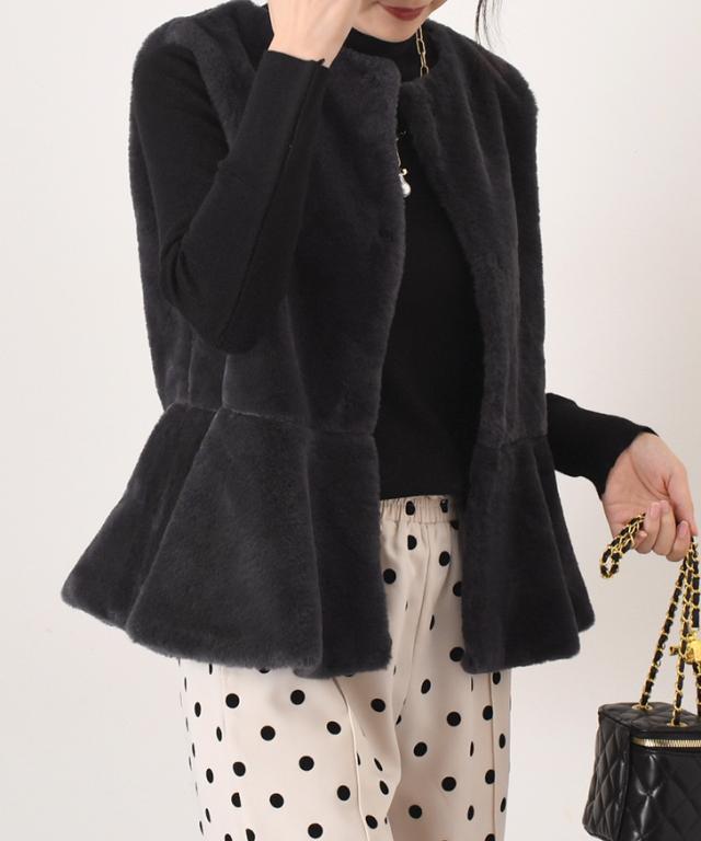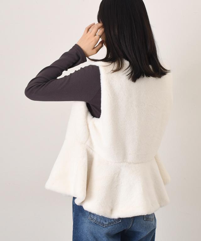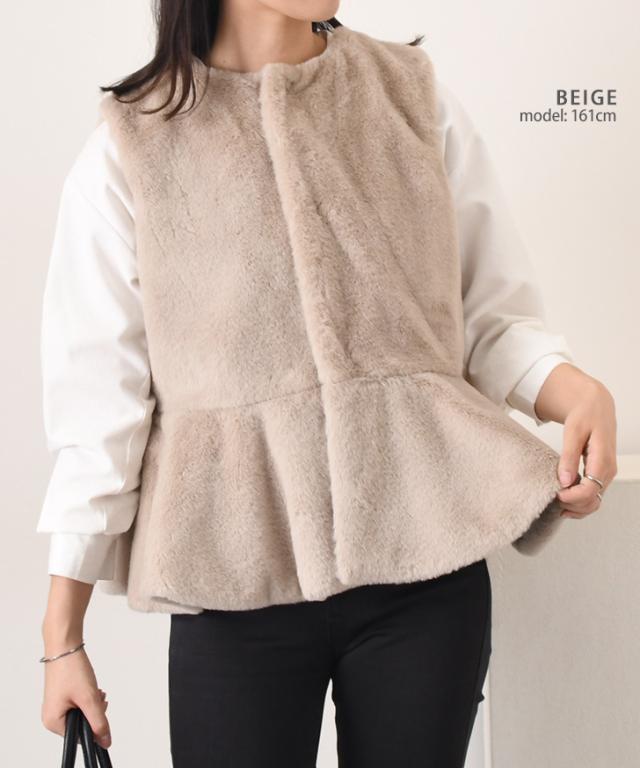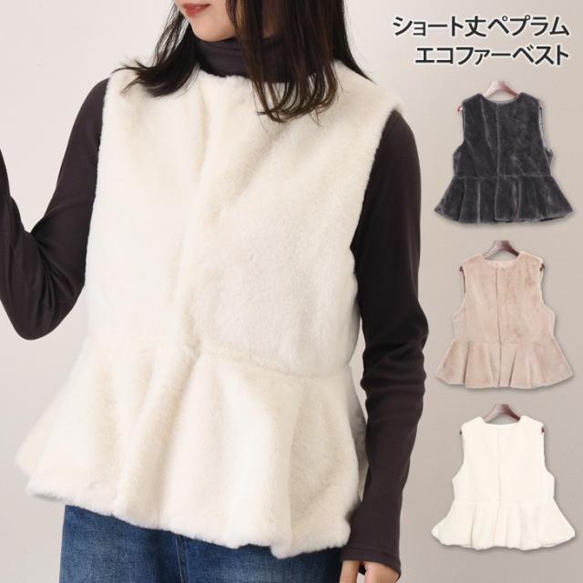 新作 ショート丈ペプラムエコファーベスト レディース アウター フェイクファー 前開き おしゃれ ジレ ノーカラー 軽量 軽い ボリューム感 羽織り 秋冬 きれいめ Aライン 大人可愛い 防寒 暖かい あったか
