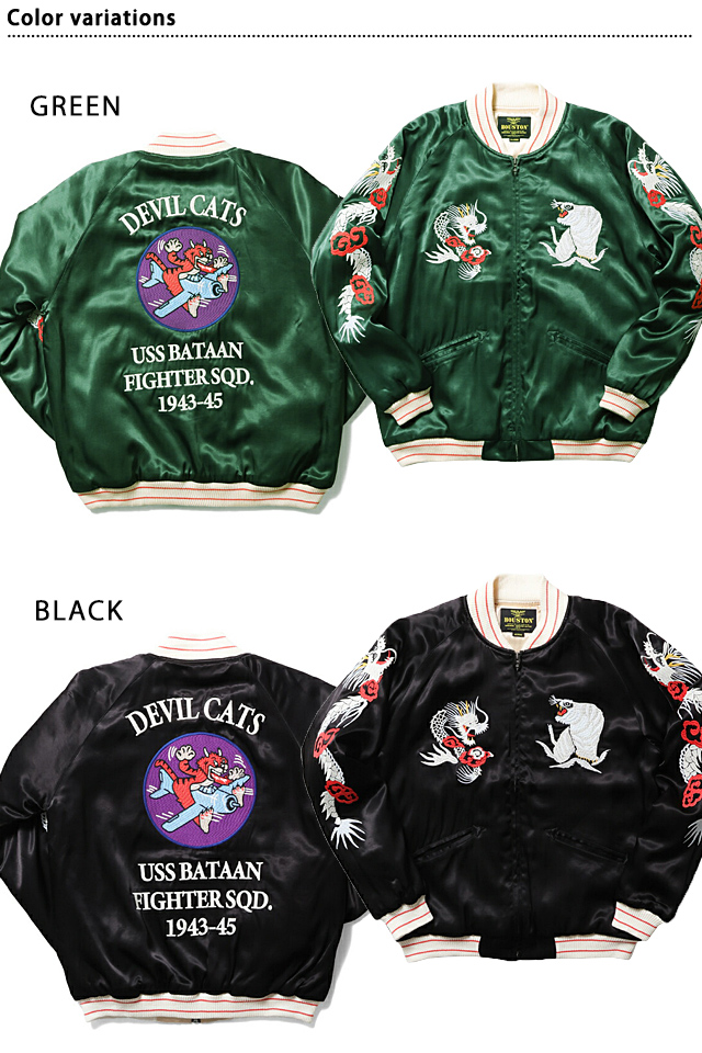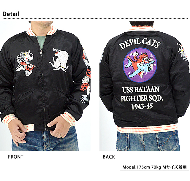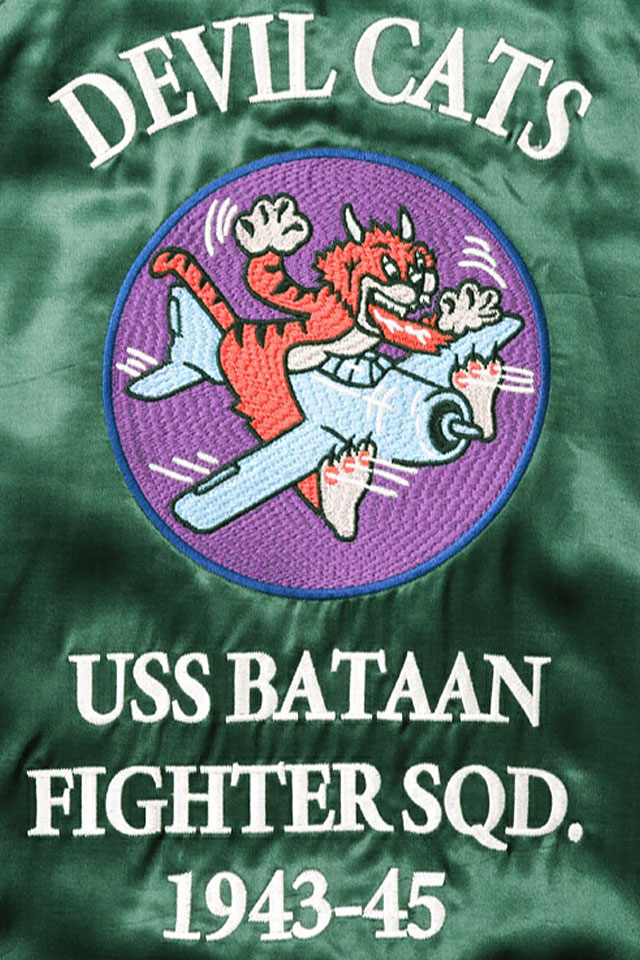 両胸と袖にはビンテージライクな龍虎をデザインし、背面にはアメリカ海軍VF-50戦闘飛行隊「デビルキャッツ」をサンプリングした凹凸感のある刺繍を配置しました。