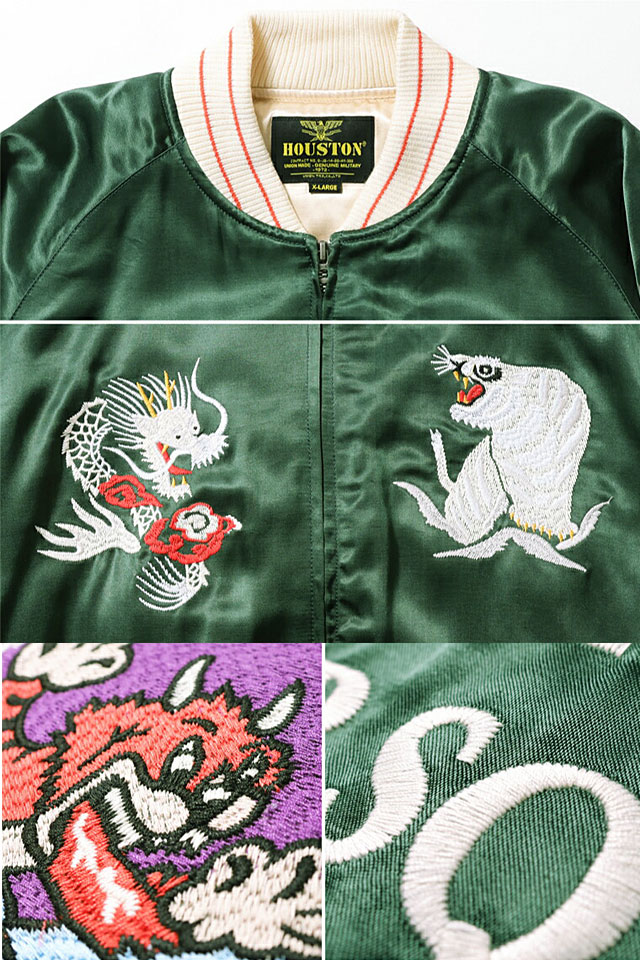 日本で初めてオリジナルのフライトジャケットを生み出し、その後も数々の国内製ミリタリー商品を製造する「ヒューストン」から、レーヨンスーベニアジャケット「DEVIL CATS」(51400)のご紹介です。 肌触りがよく肉厚でハリ感のあるレーヨンサテン生地を使用したスカジャン。 両胸と袖にはビンテージライクな龍虎をデザインし、背面にはアメリカ海軍VF-50戦闘飛行隊「デビルキャッツ」をサンプリングした凹凸感のある刺繍を配置しました。 刺繍部分は手振り風の刺繍で仕上げているため、凹凸がありクラシカルな見た目を演出。 艶めかしい光沢感が魅力のスーベニアジャケットに仕上がっております。 | ||||||||||||||||||||