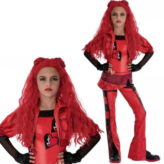 この大胆な衣装は、鮮やかな赤と黒のデザインでレッドの大胆なスタイルを表現しており、このシリーズのファンなら誰でも気に入るでしょう。このコスチュームには、ハートで覆われた重ね着風のシャツとクロップド丈のジャケット、フレアパンツ、ハートのベルト、指なし手袋が含まれており、ディセンダントのハロウィーンや映画鑑賞の夜に最適です。