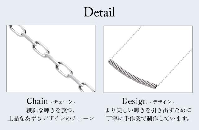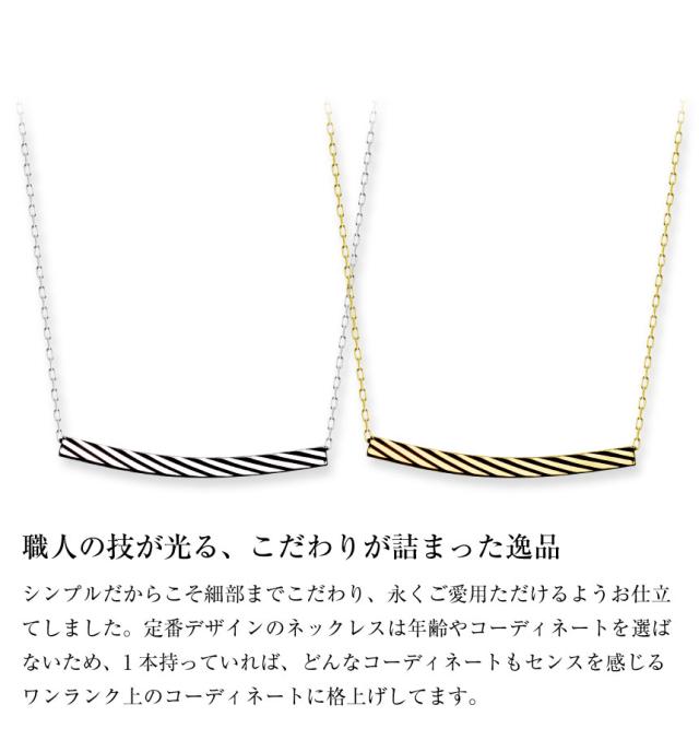 地金の表面に斜めストライプを施したトレンドのアーチ型のネックレス。