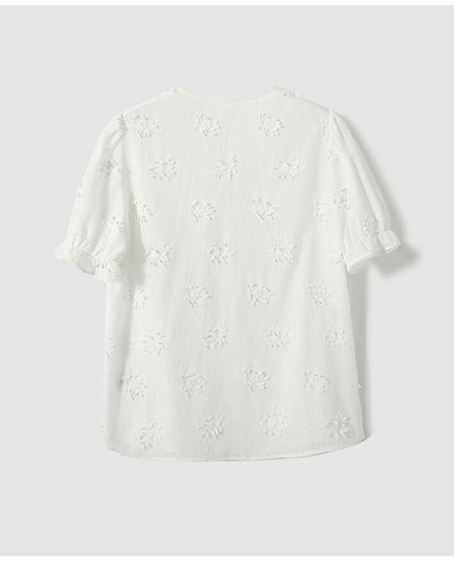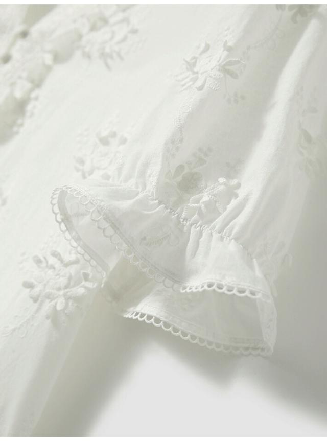 関連キーワード:刺繍ブラウス、綿100%、白ブラウス、夏服、オフィスカジュアル、フリル袖