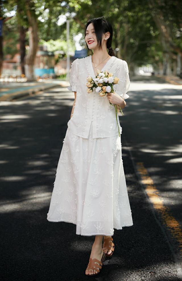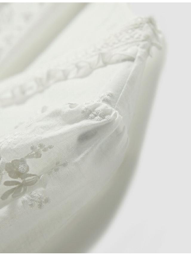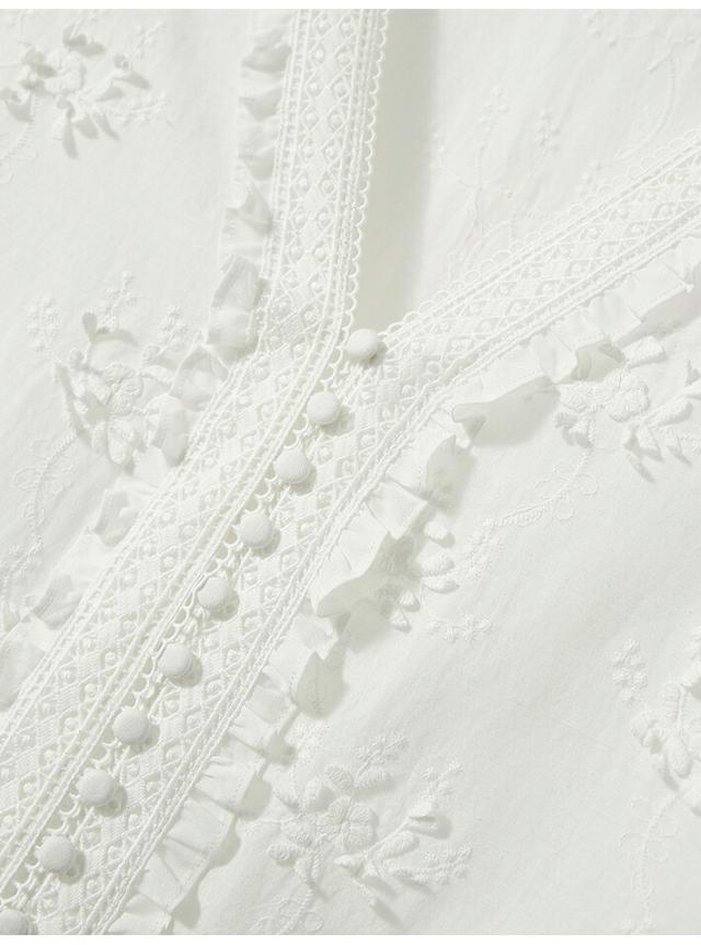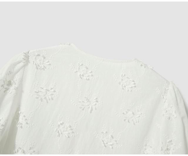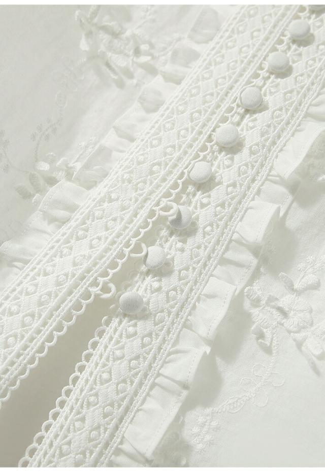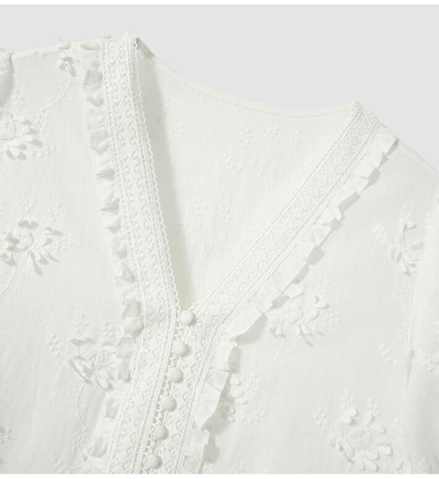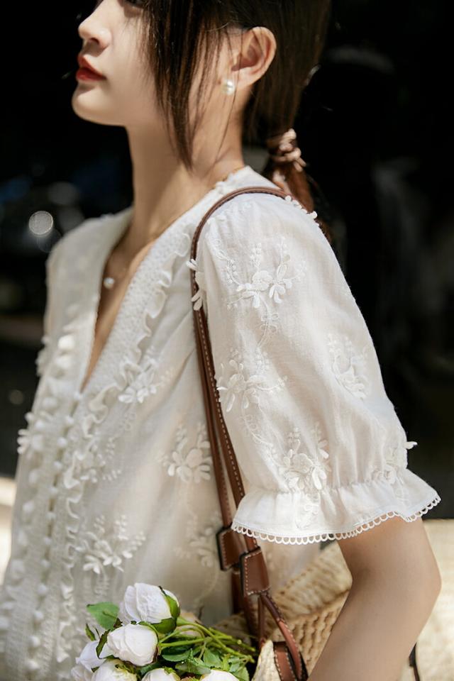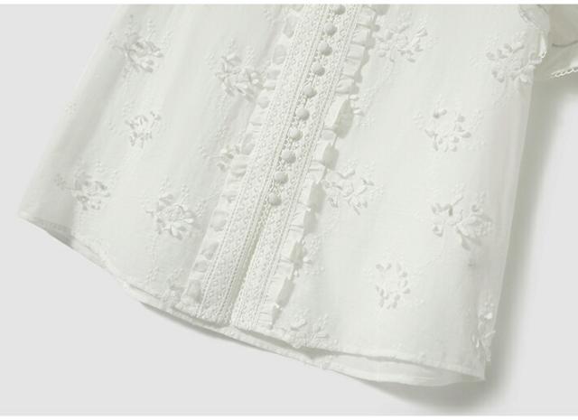 通気性抜群の綿100%白刺繍ブラウス、軽やかなフリル袖で大人のフェミニンコーデを実現